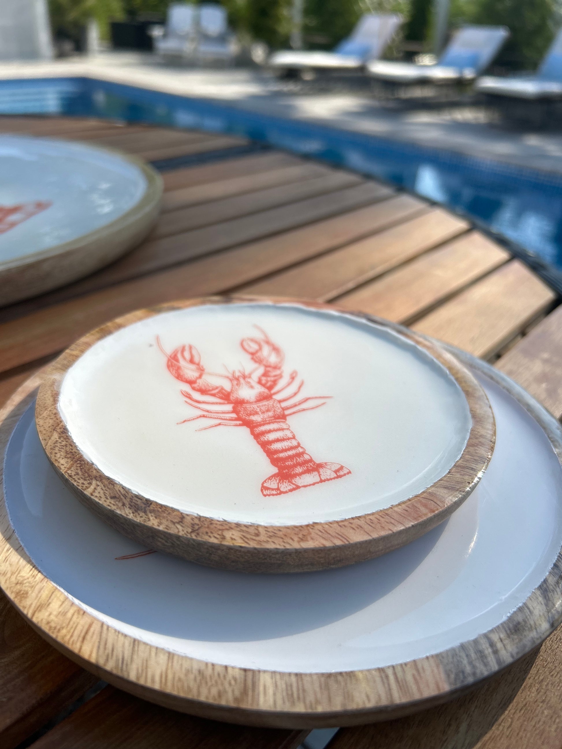 Assietten har ett mönster med ett hummermotiv. Fin till tilltugg eller uppläggning. Eftersom de är handgjorda är varje fat unikt.