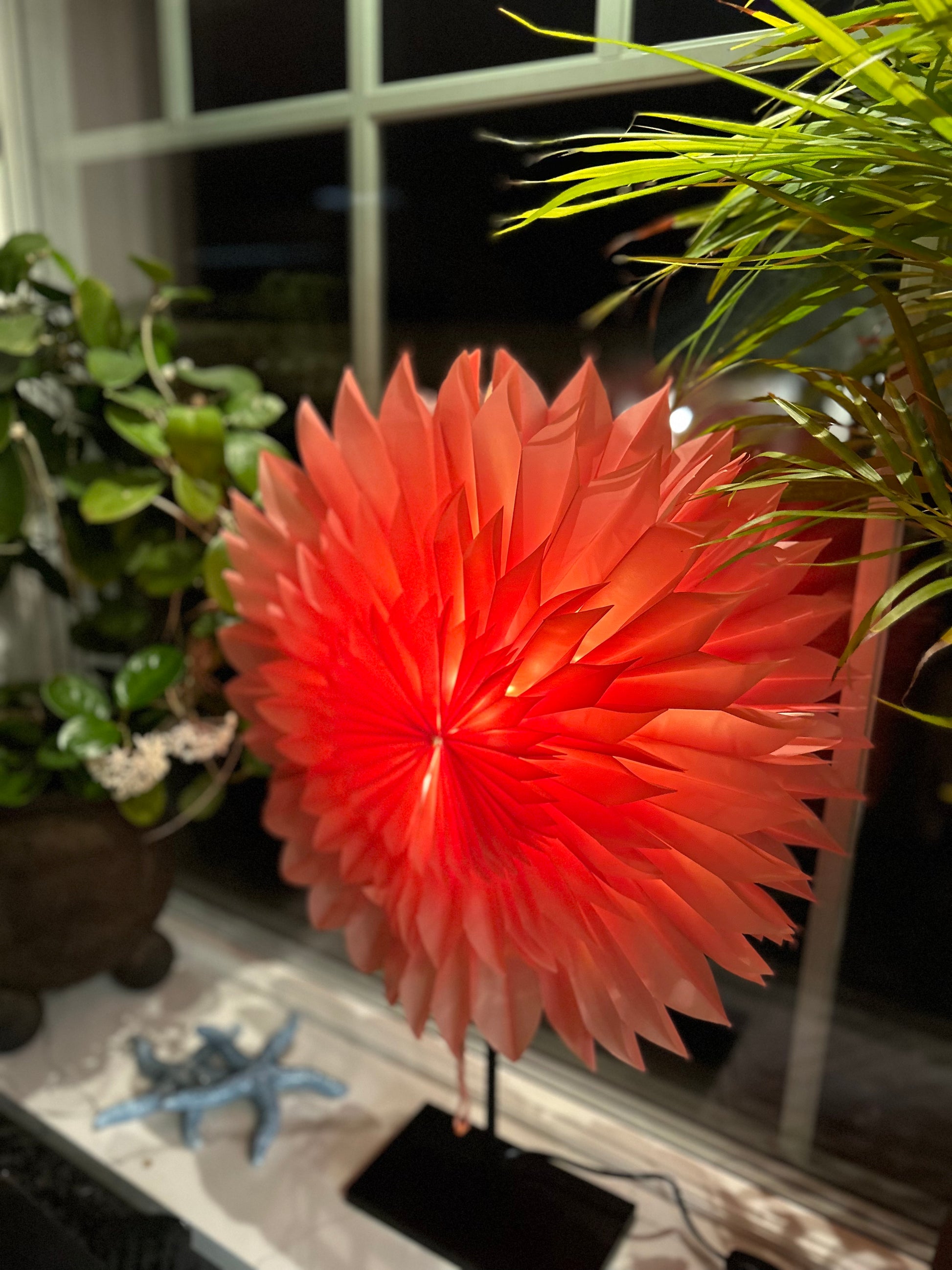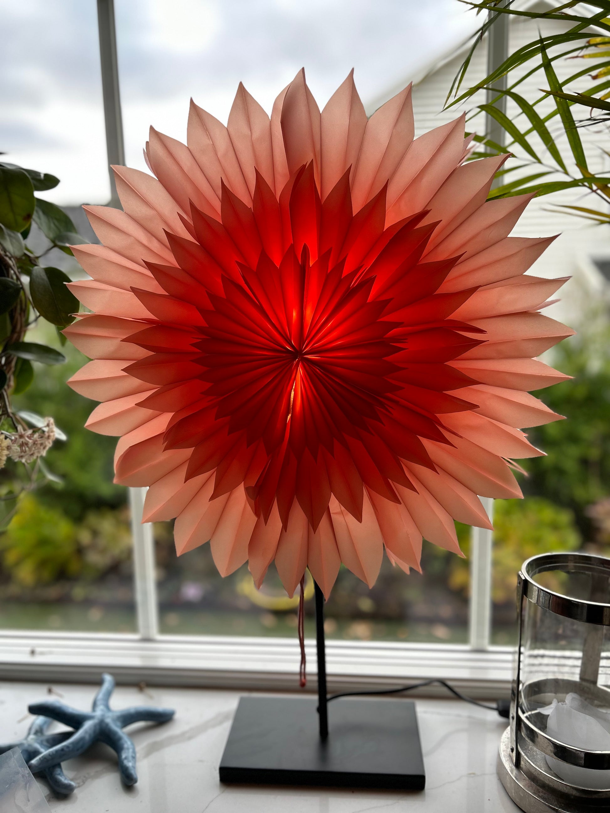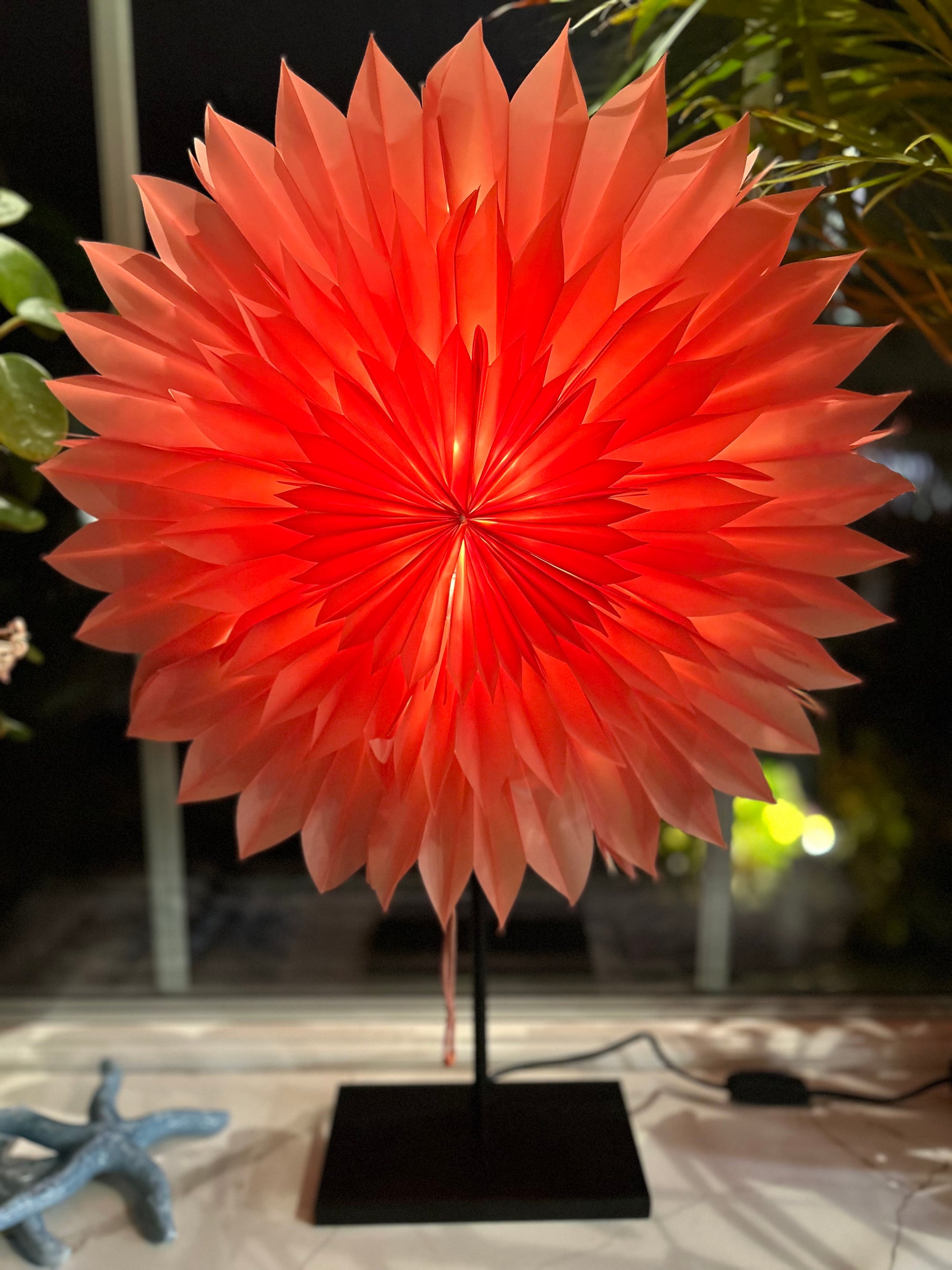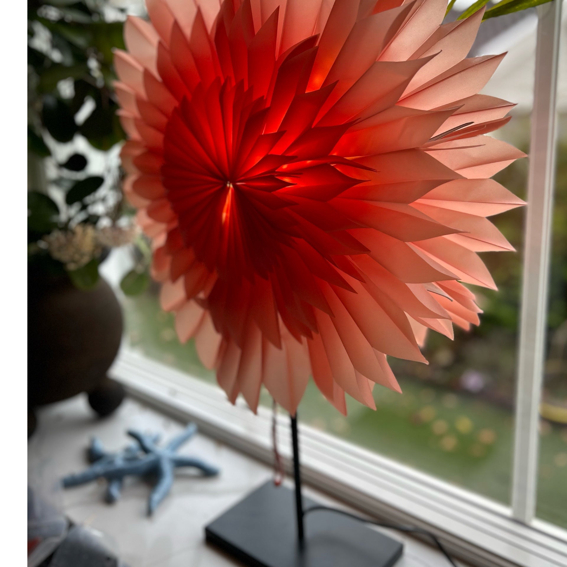 Wow - den här fina bordsstjärnan har verkligen en wow-faktor! En bordstjärna med stjärna av smörpapperskvalitet. Pappret är infärgat i svagt orange-rosa och uppbyggd i tre olika lager. Lampfoten är låg och har en rektangulär fot, som står stadigt i fönstret. Totalhöjd 65cm. Använd endast LED lampa.