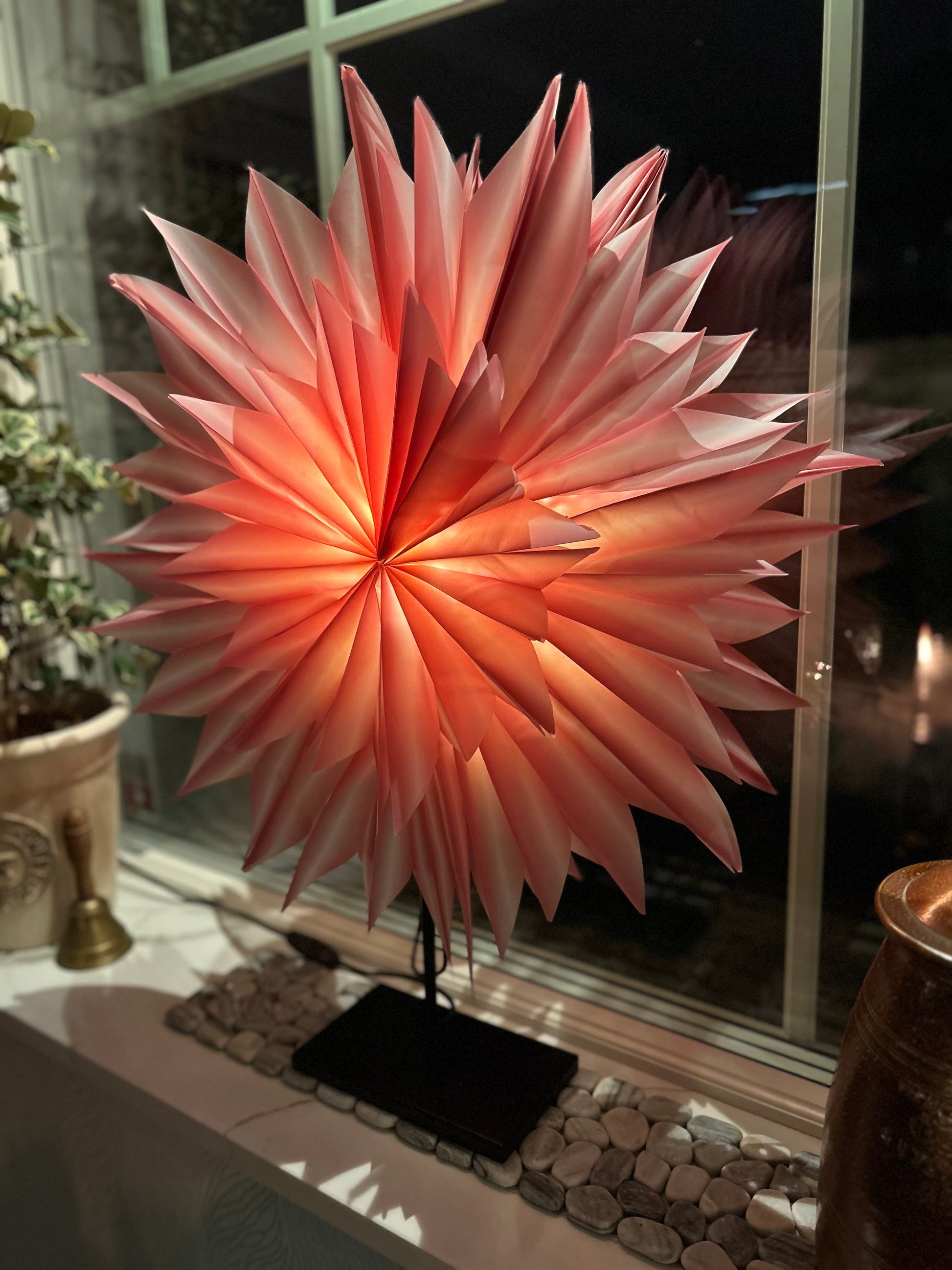 En sådan vacker bordsstjärna! Blir garanterat en favorit!En bordstjärna med stjärna av smörpapperskvalitet. Pappret är tryckt med en "ombreeffekt" dvs varje pappersveck pendlar mellan ofärgat till mörkare rött. Lampfoten är låg och har en rektangulär fot, som står stadigt i fönstret. Totalhöjd 70cm. Andvänd endast med LED lampa.