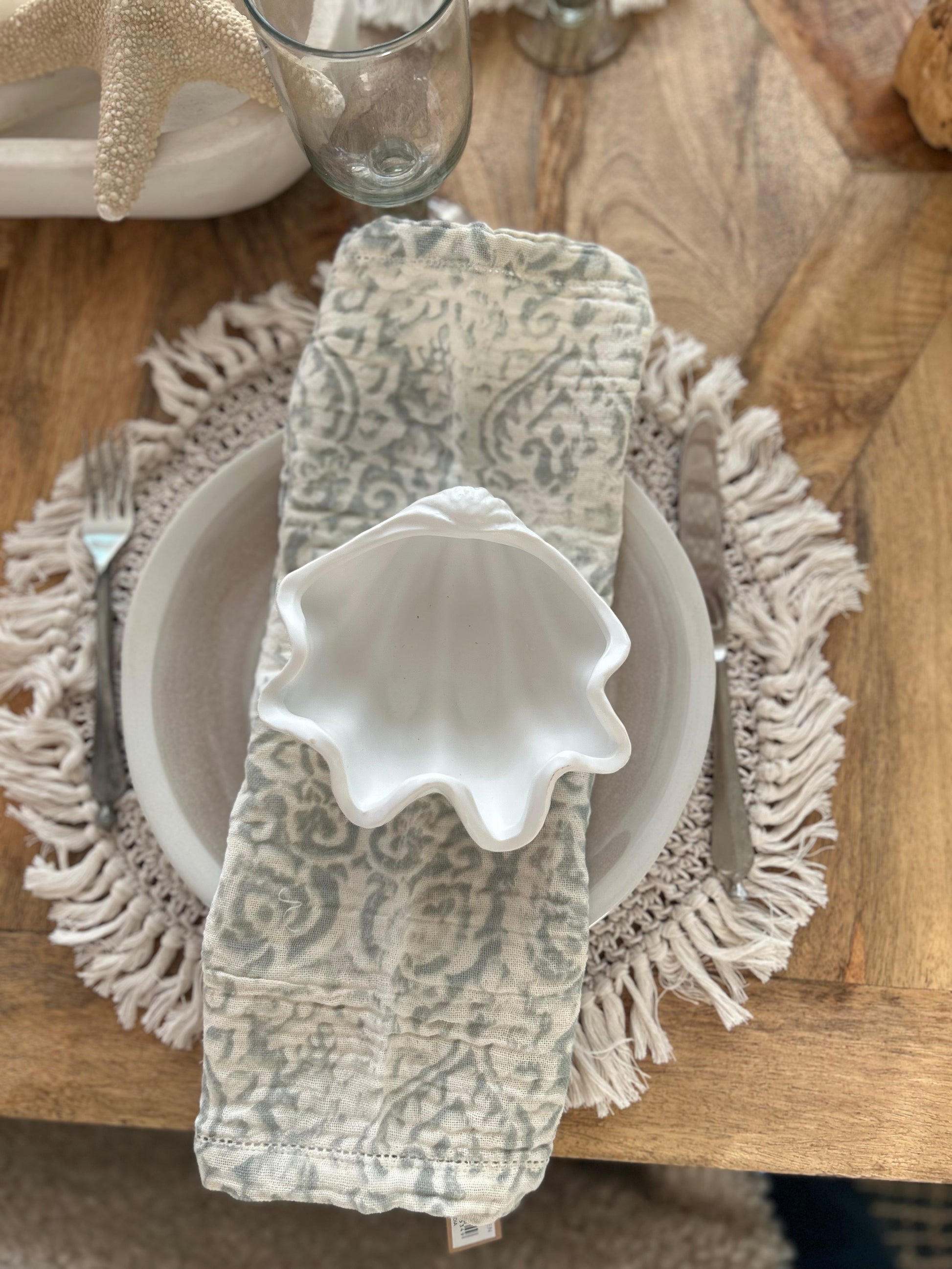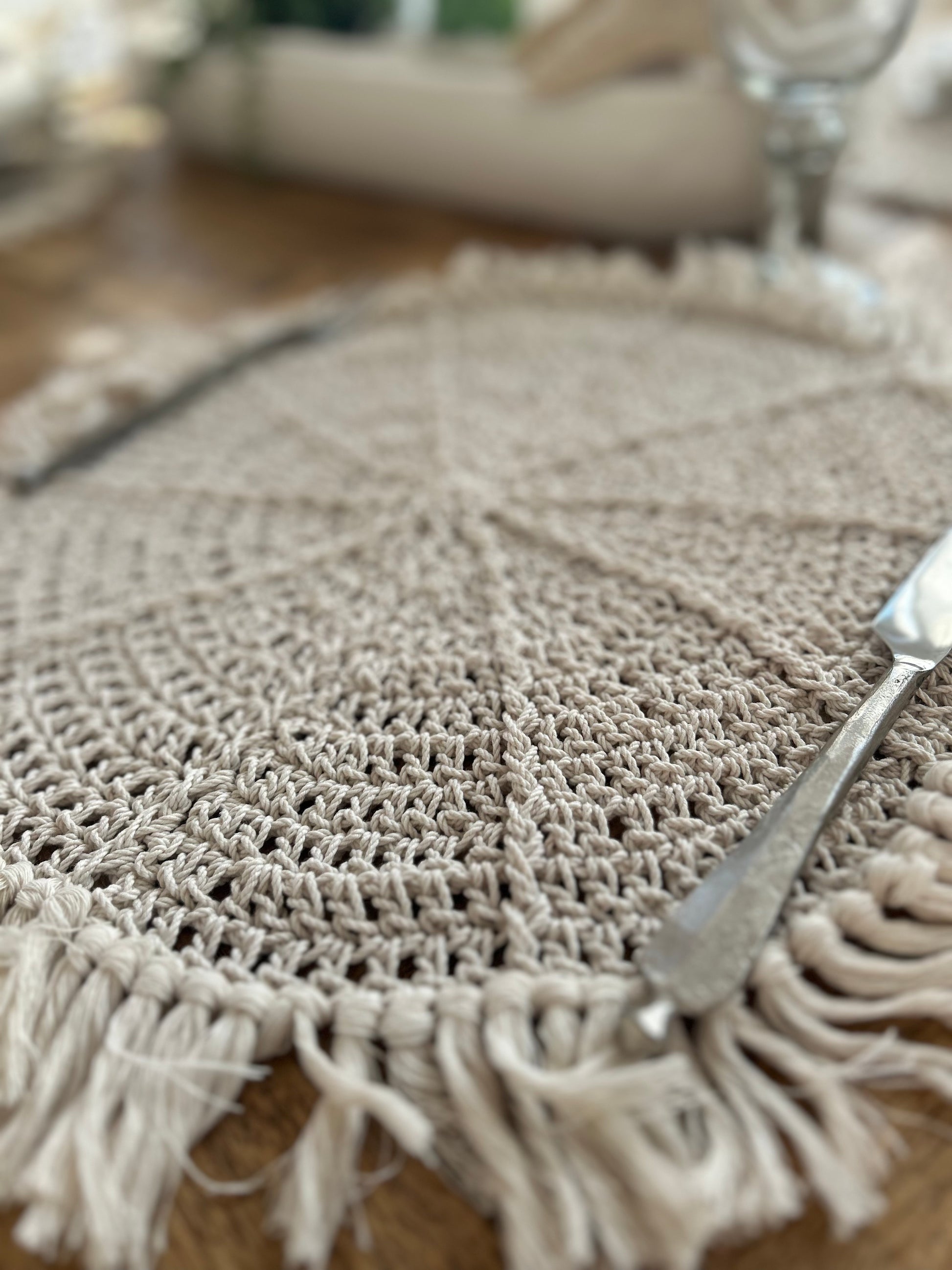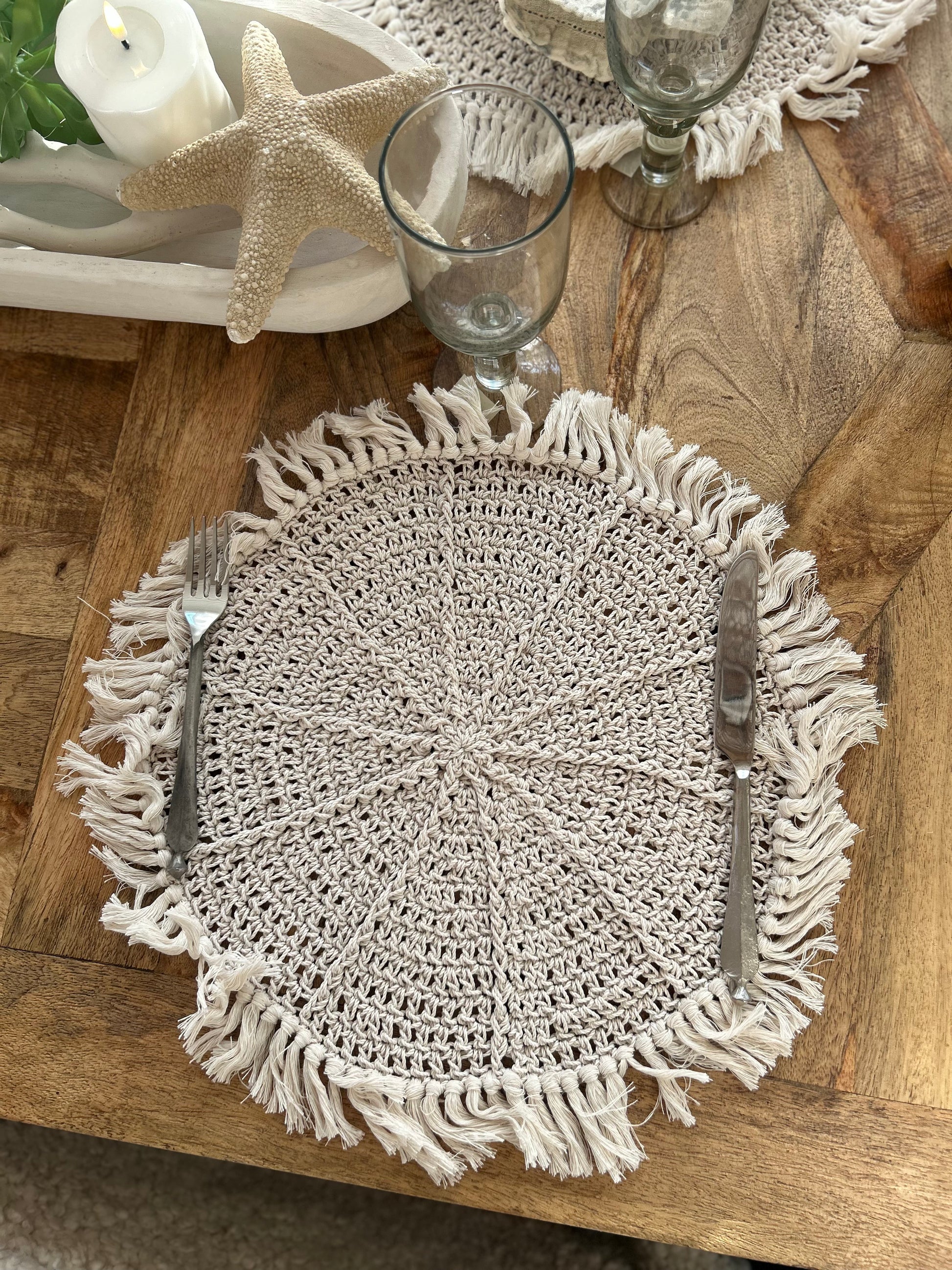 Nyhet! En virkad rund bordstablett med frans i lite bohemisk stil. Säljs i 2-pack