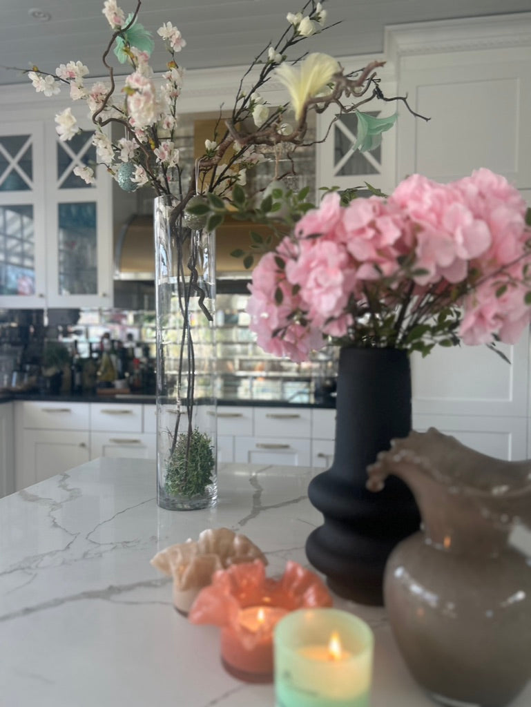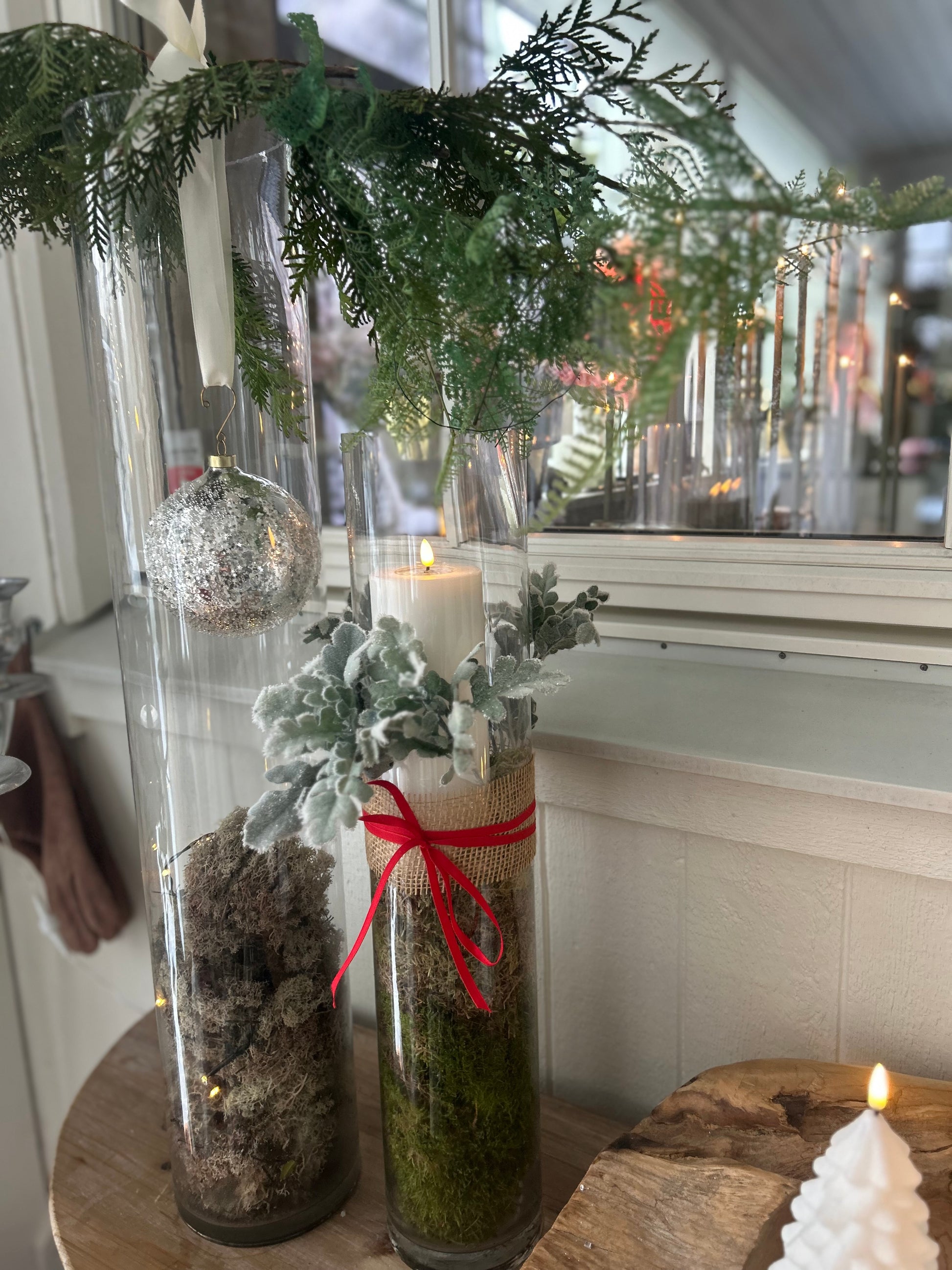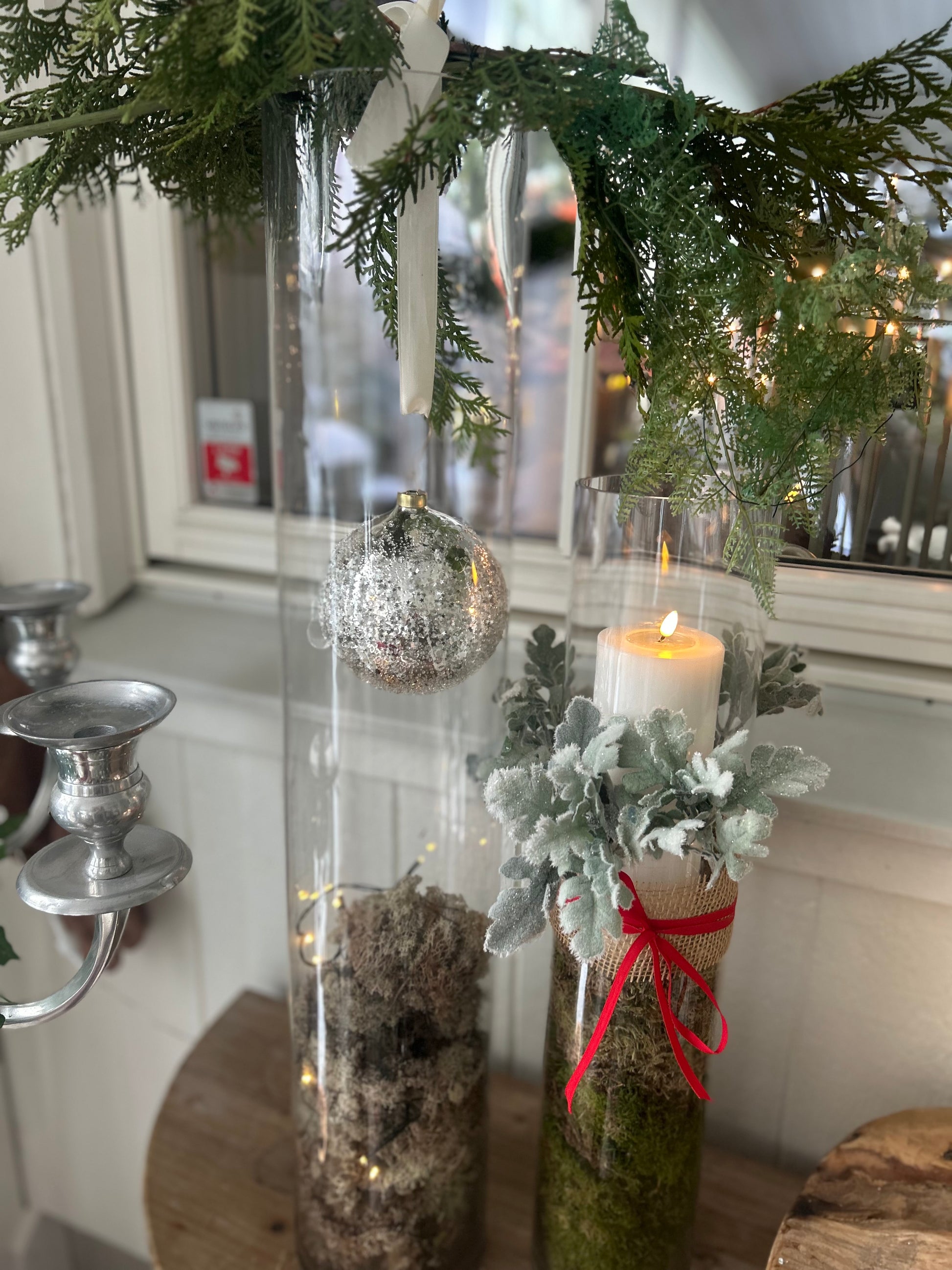 En enkel men så praktisk hög vas på 80cm som kan dekoreras på olika sätt. Så snygg med en kvist i eller som här fylld med mossa med en hängande kula.