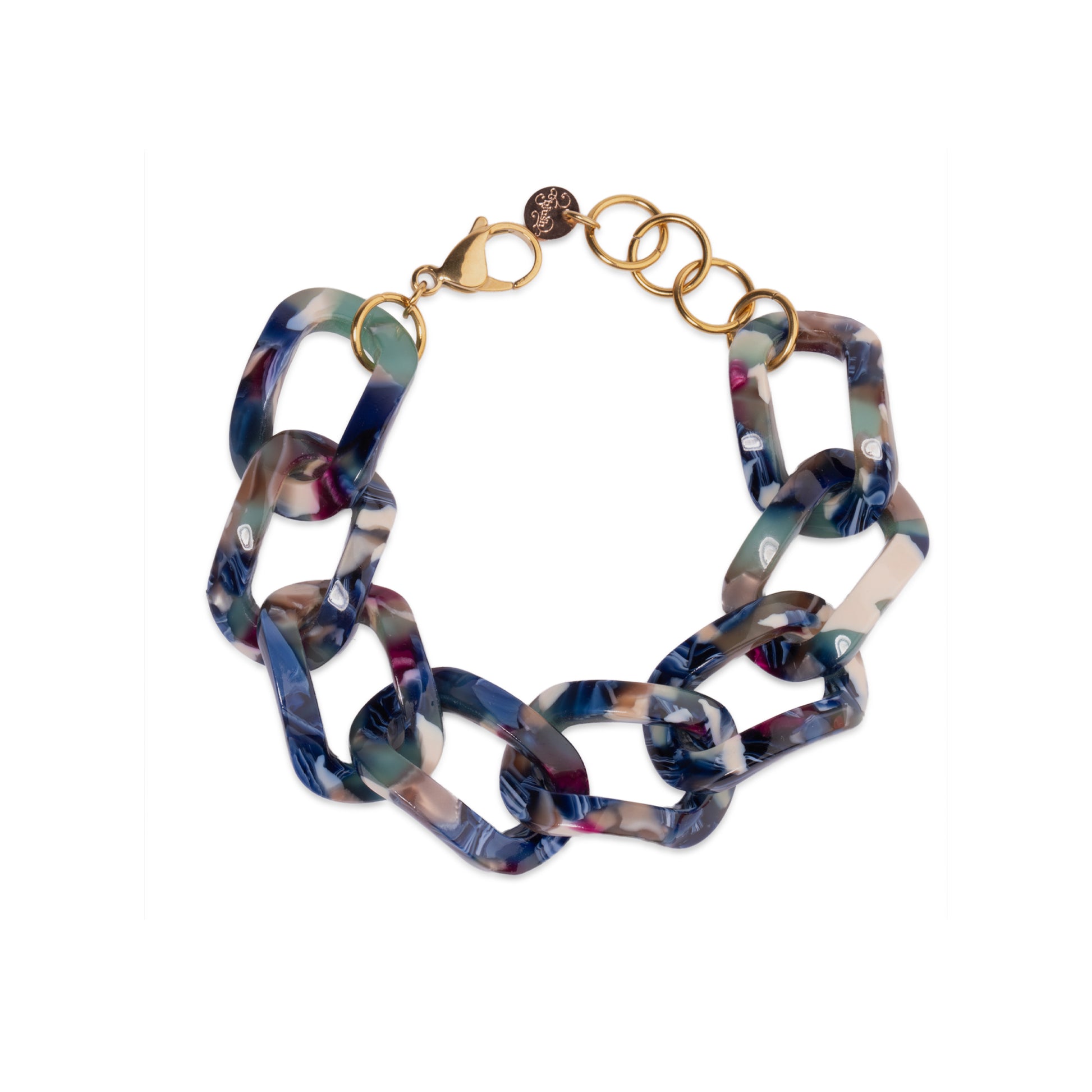 Ett coolt resinarmband i melerat blå färg., Knäppet och förlängningskedjan är i guldpläterat rostfritt stål. Nickelsäkert. Finns att matcha med långt halsband.