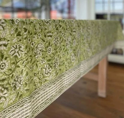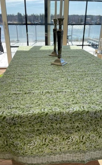 En vacker duk med design influerad av Mughal mönster från 1300-talet, men modifierad med skandinavisk färgskala. Duken är handgjord och kommer från Indien.