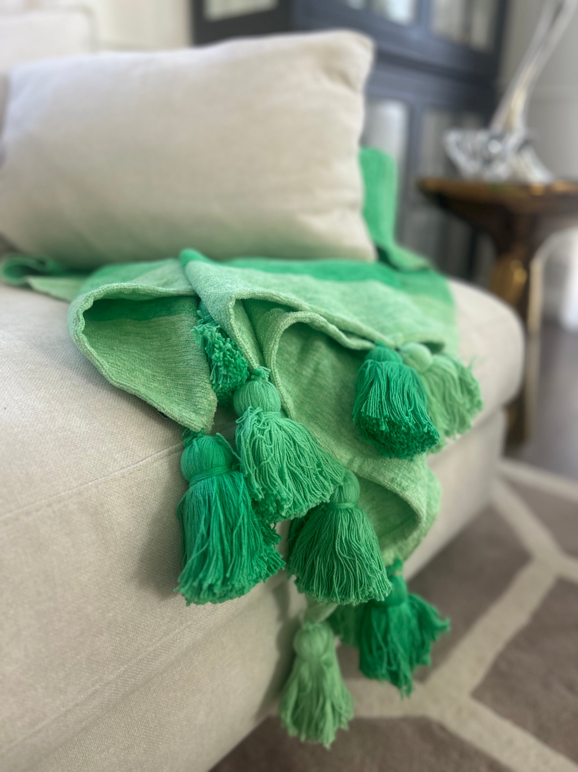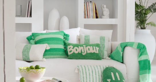 Man blir så glad av denna serie av textilier som det belgiska företaget Jolipa har tagit fram i starka härliga färger. Denna randiga filt eller pläd i grönt lyser upp vilket rum som helst - både ute och inomhus. Finns även orangegul randig pläd samt kuddar i denna serie.