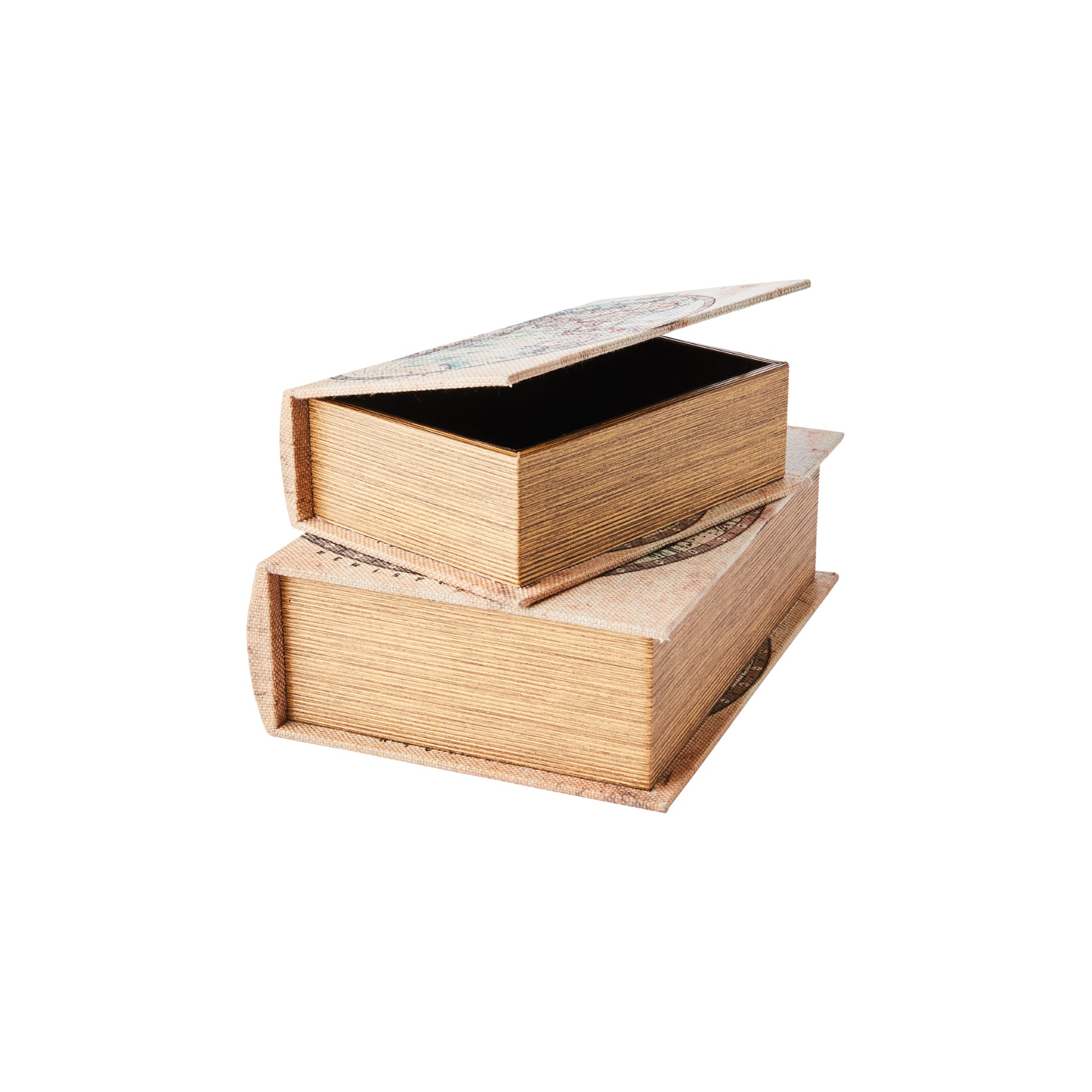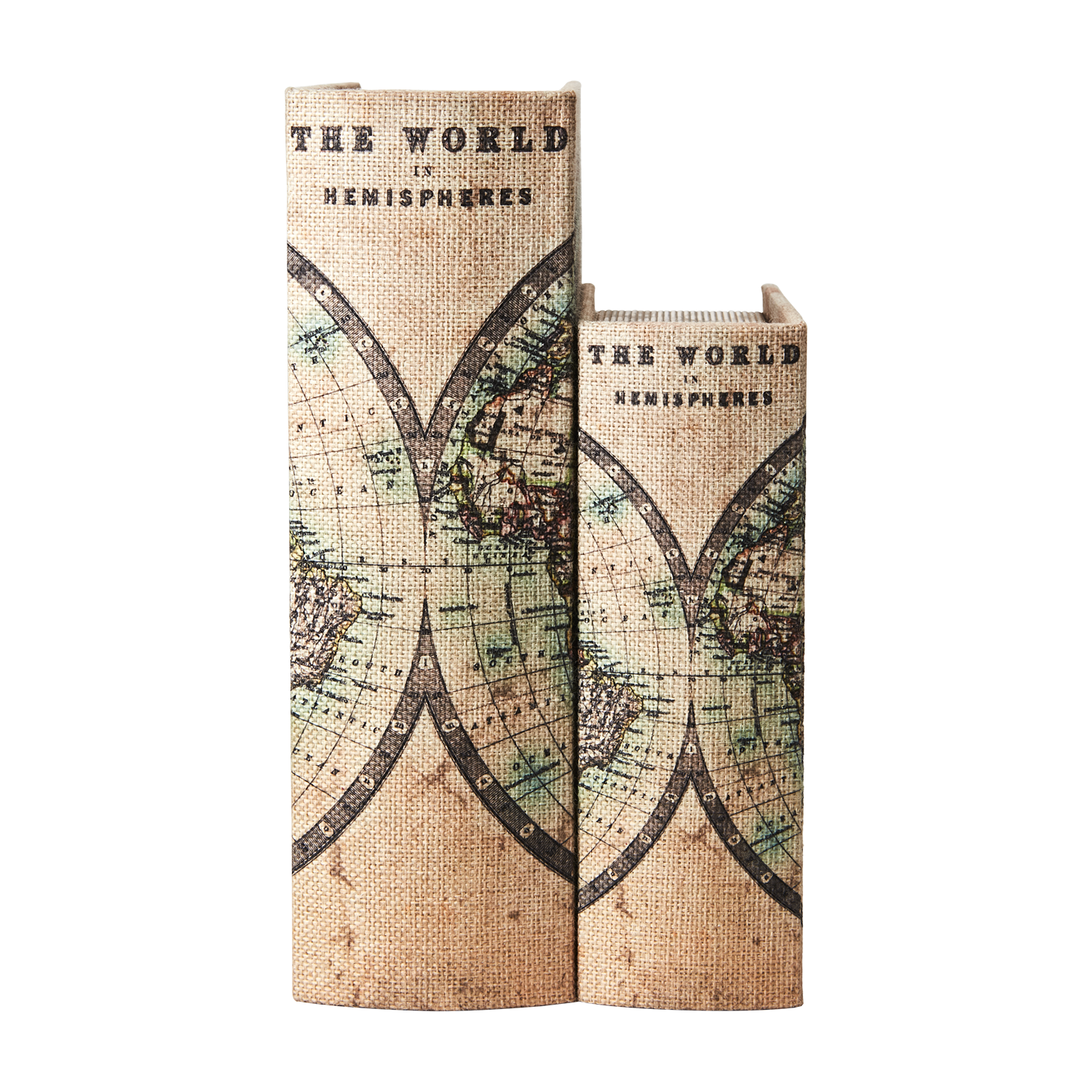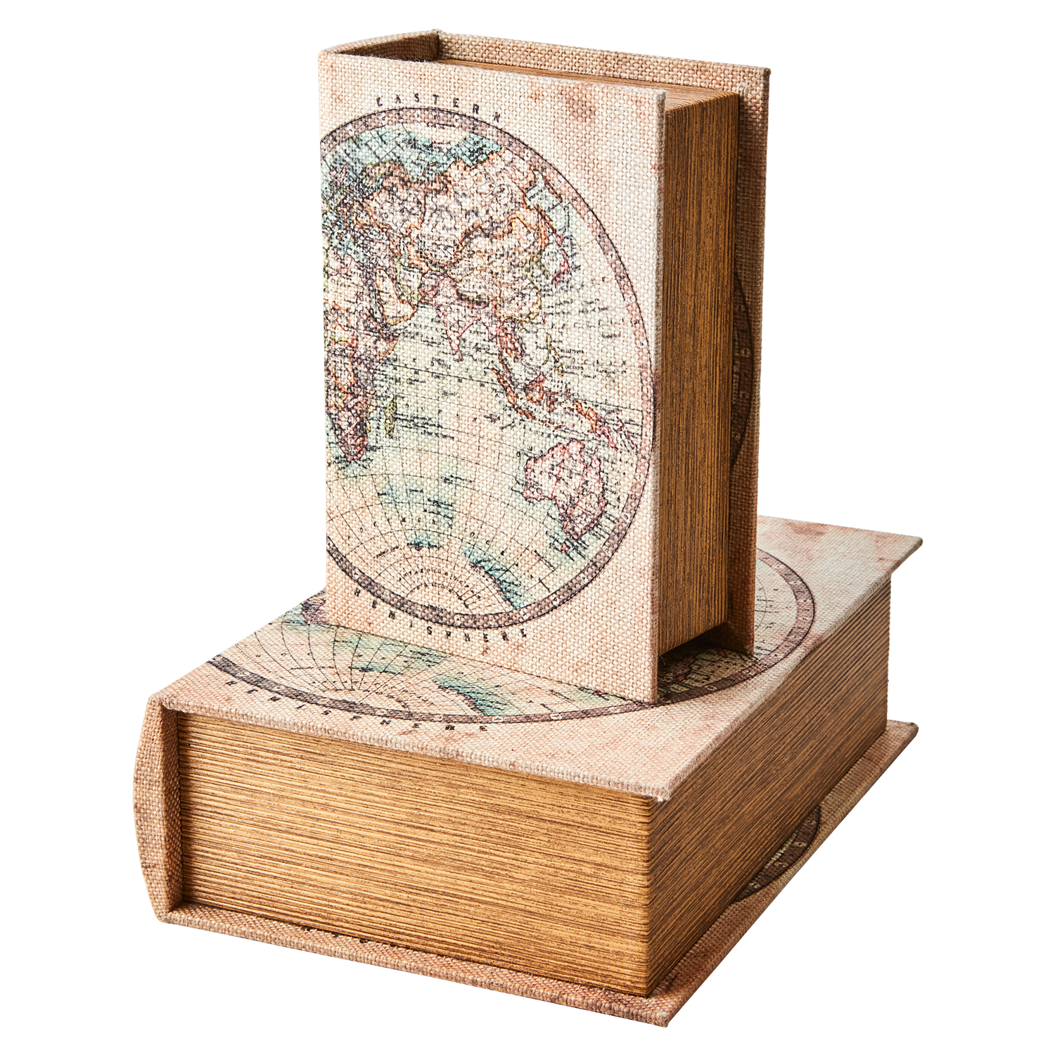 Superfina dekorativa förvaringsboxar som ser ut som gamla böcker. Den linneklädda ytan har ett gammaldags tryck av Världskartan. De levereras som 2 böcker i ett set och den mindre boken får plats i den större. Perfekt för att dölja småsaker du behöver men inte ska synas såsom nycklar. Eller varför inte använda som vackra böcker i bokhyllan.