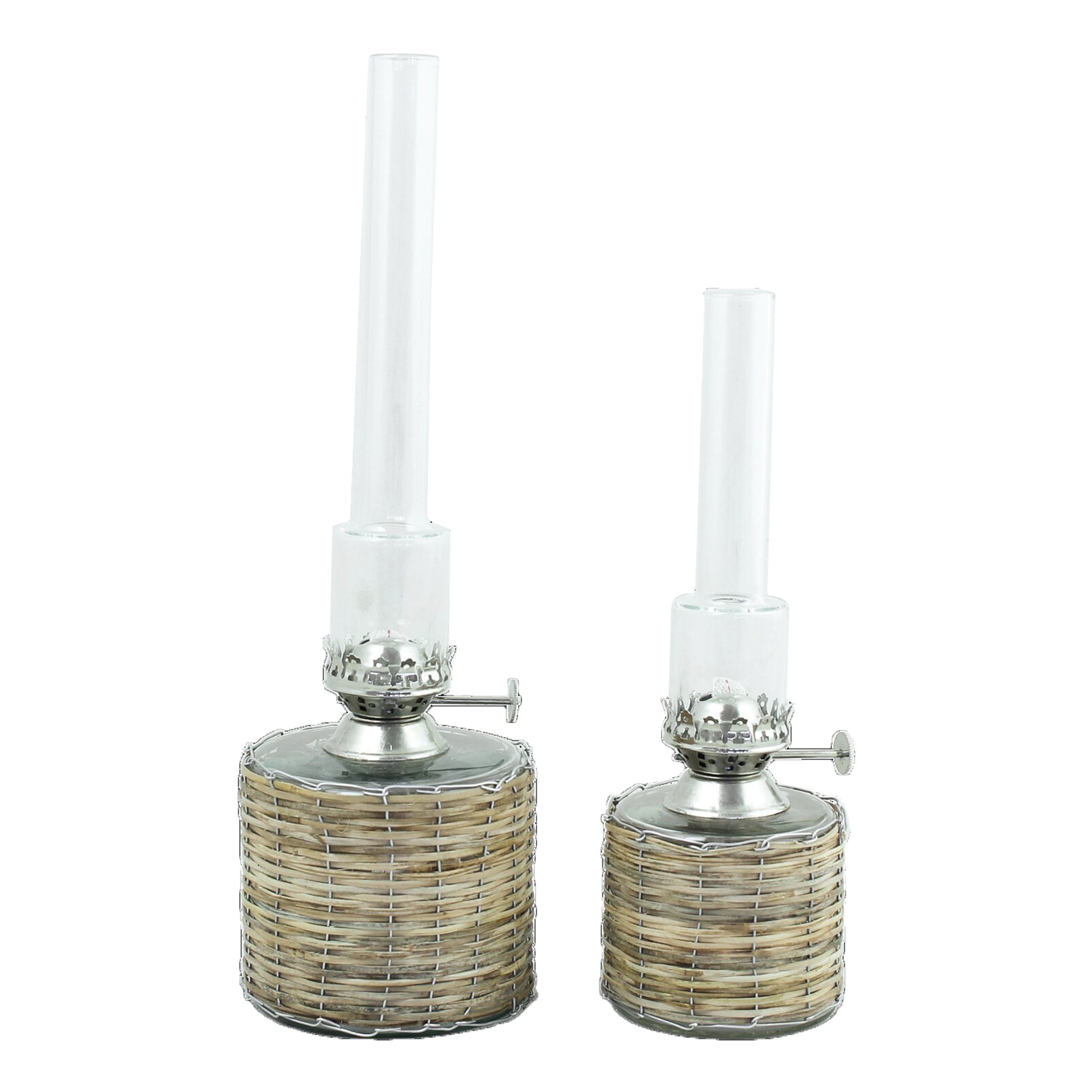 Rak fotogenlampa i glas och flätad korg och brännare i nickel. Lampan har ett lite mer rustikt utseende med en lantlig touch. kommer från svenska företaget Strömshaga.