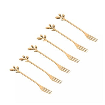 Vackra och eleganta guldförgyllda gafflar med dekoration som ett löv på skaftet. Perfekta till efterrätten eller osten. Säljes som 6-pack.