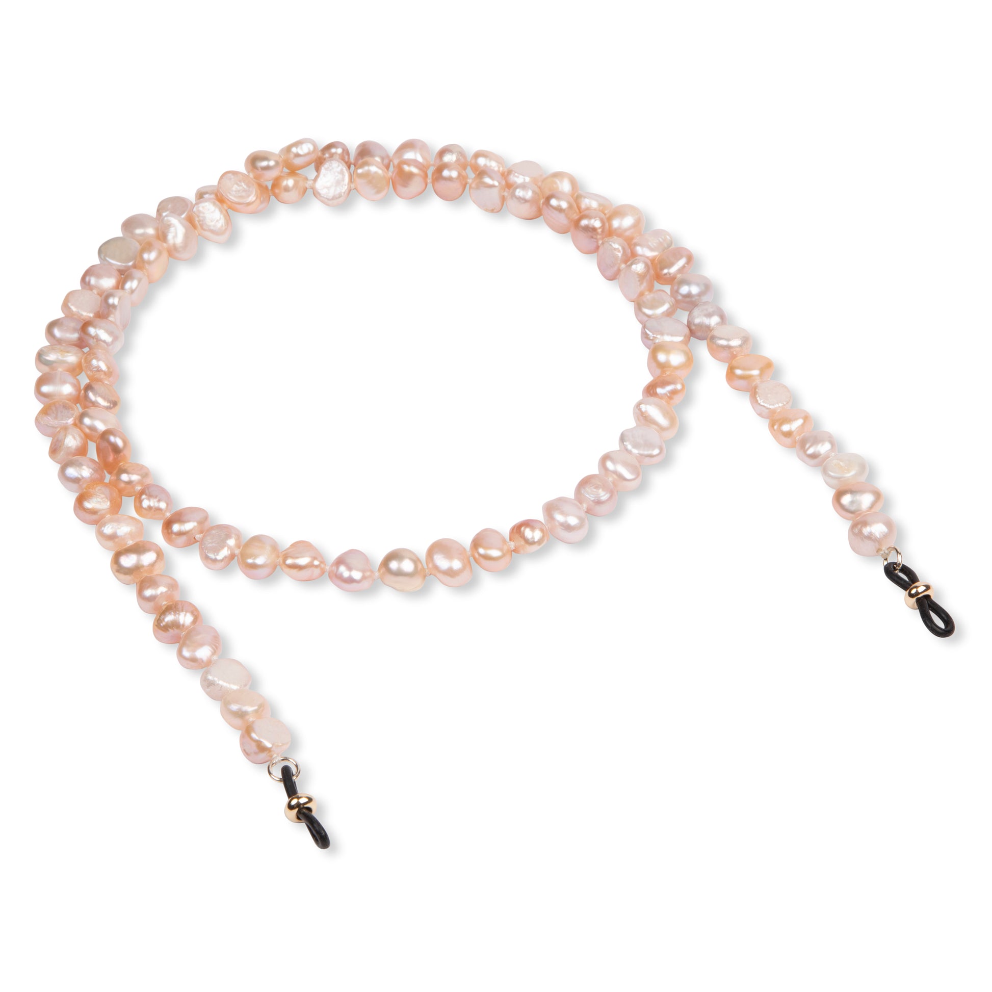 En glasögonkedja med vackra pärlor i rosa och gummi ”stoppers” (i svart och guld) som sätts fast på glasögonbågen. Kedjan är 70 cm lång.