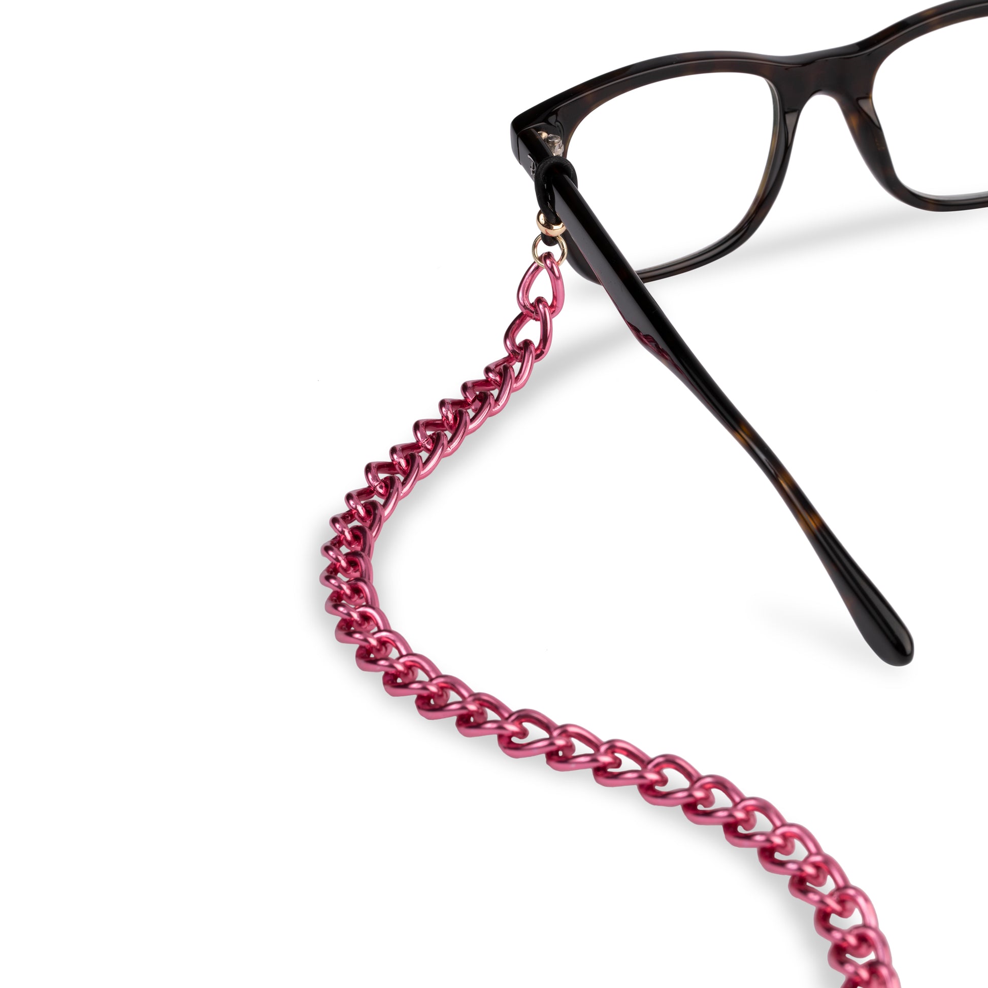 En glasögonkedja i metall med starkt rosa plätering och gummi ”stoppers” (i svart och guld) som sätts fast på glasögonbågen. Kedjan är 70 cm lång.