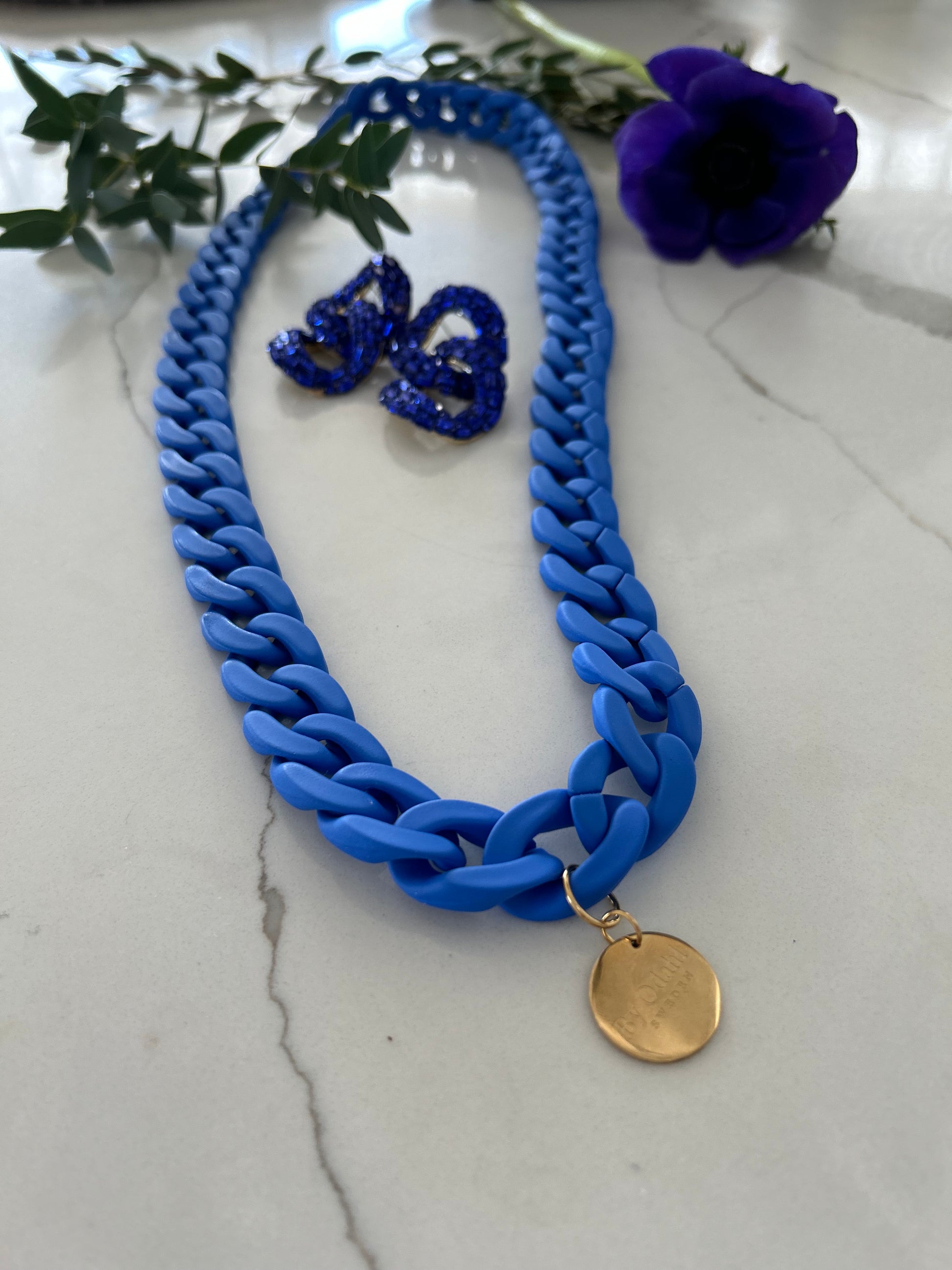 Kedjehalsband med länkar från By Odahl. Ett lite längre halsband i en av årets modefärger- kornblått! Väger nästan ingenting.