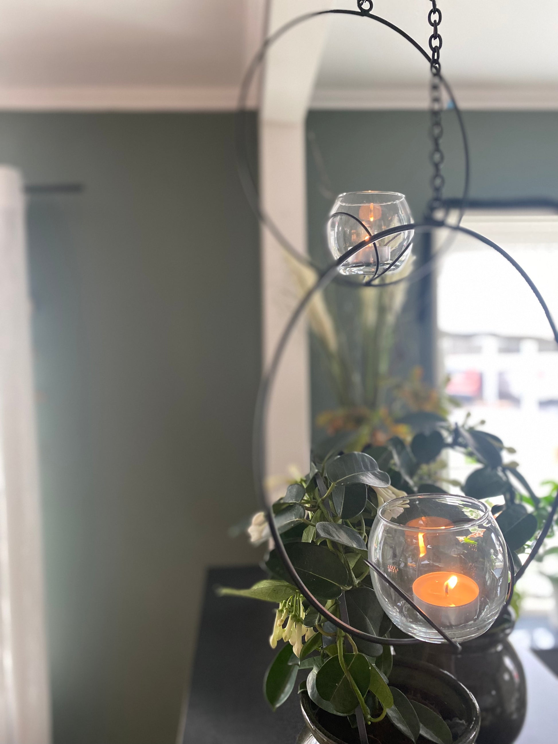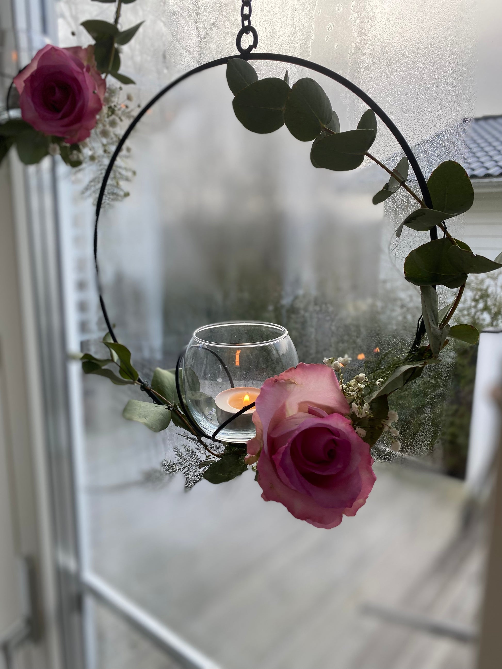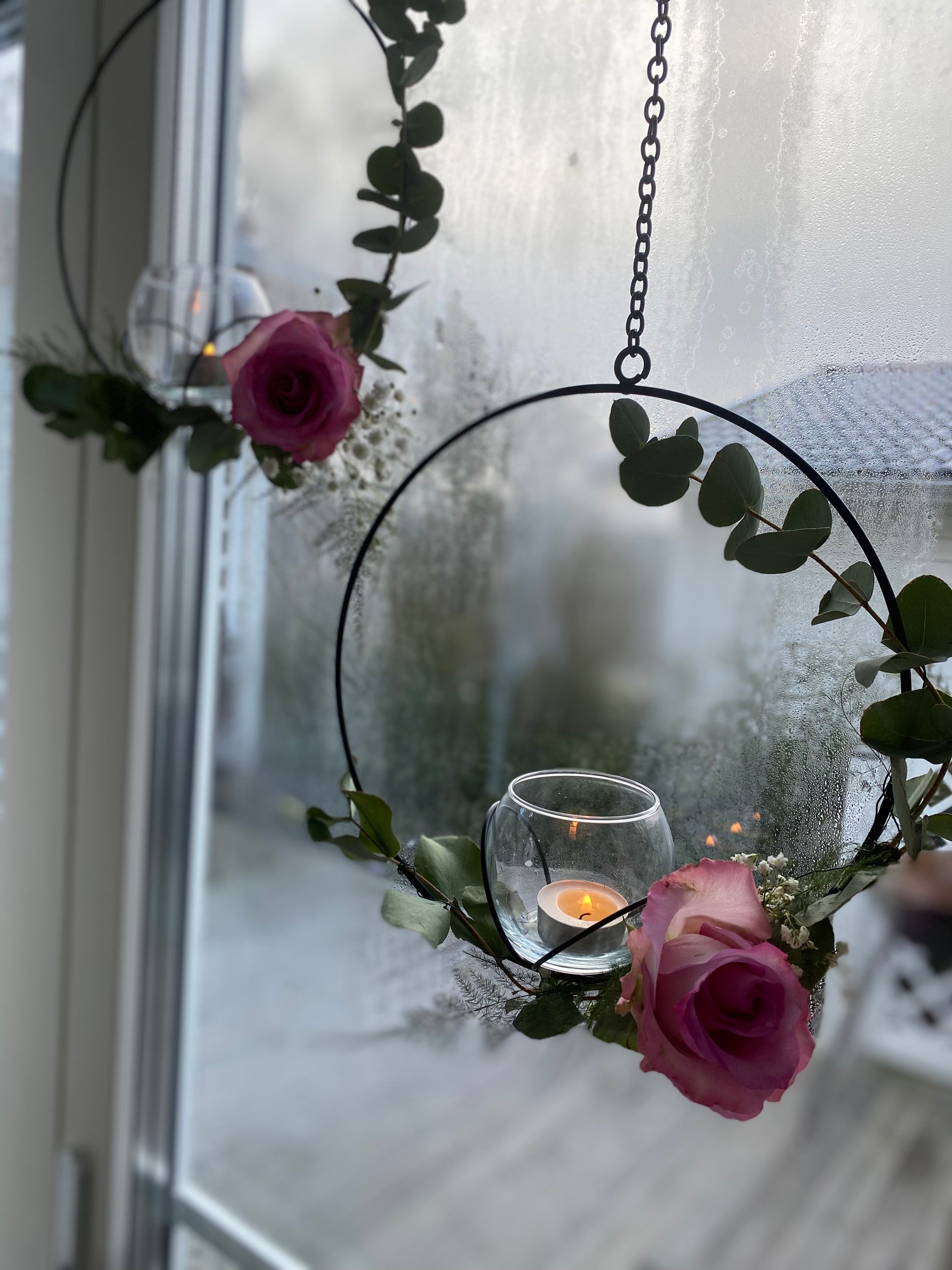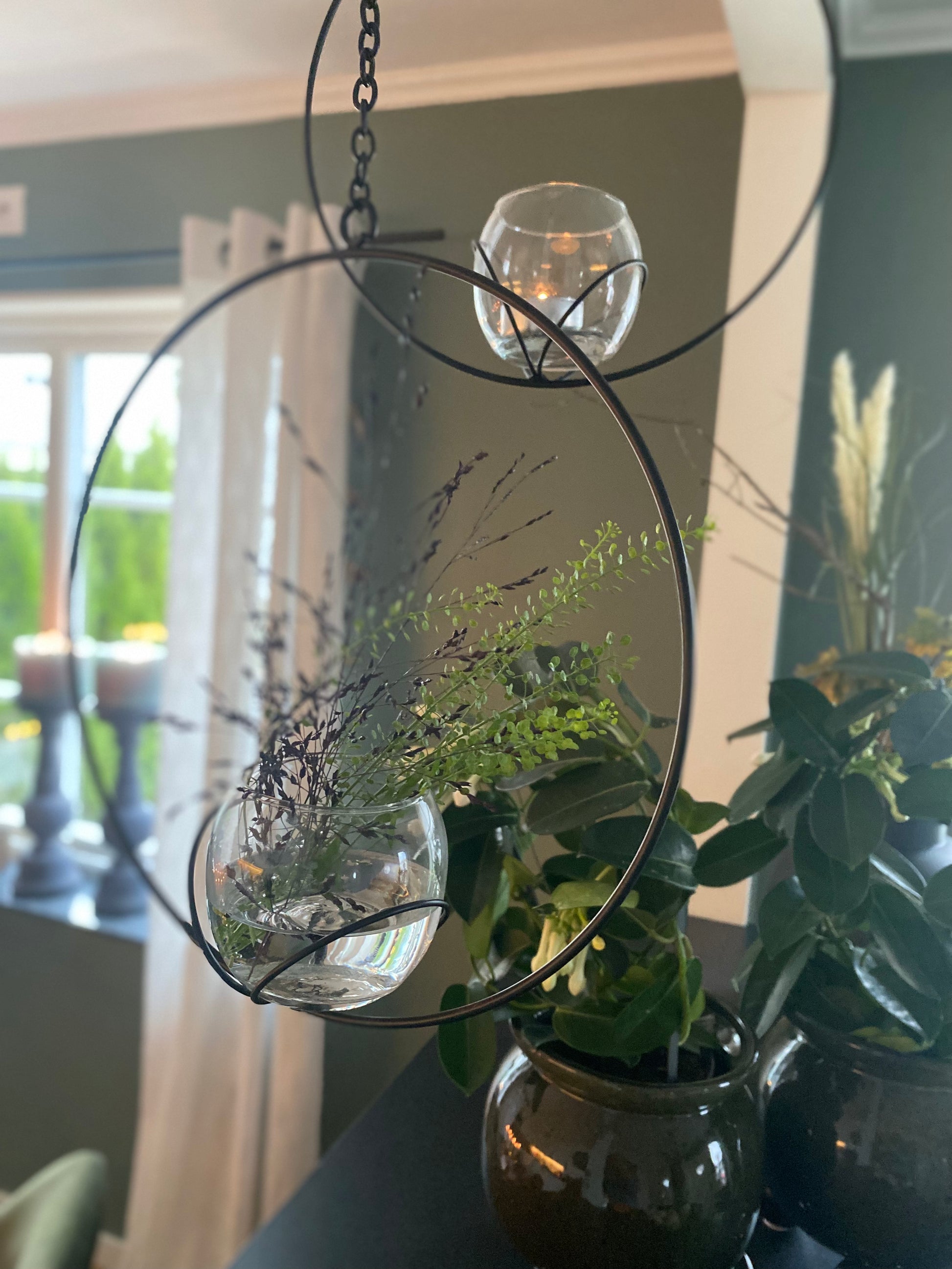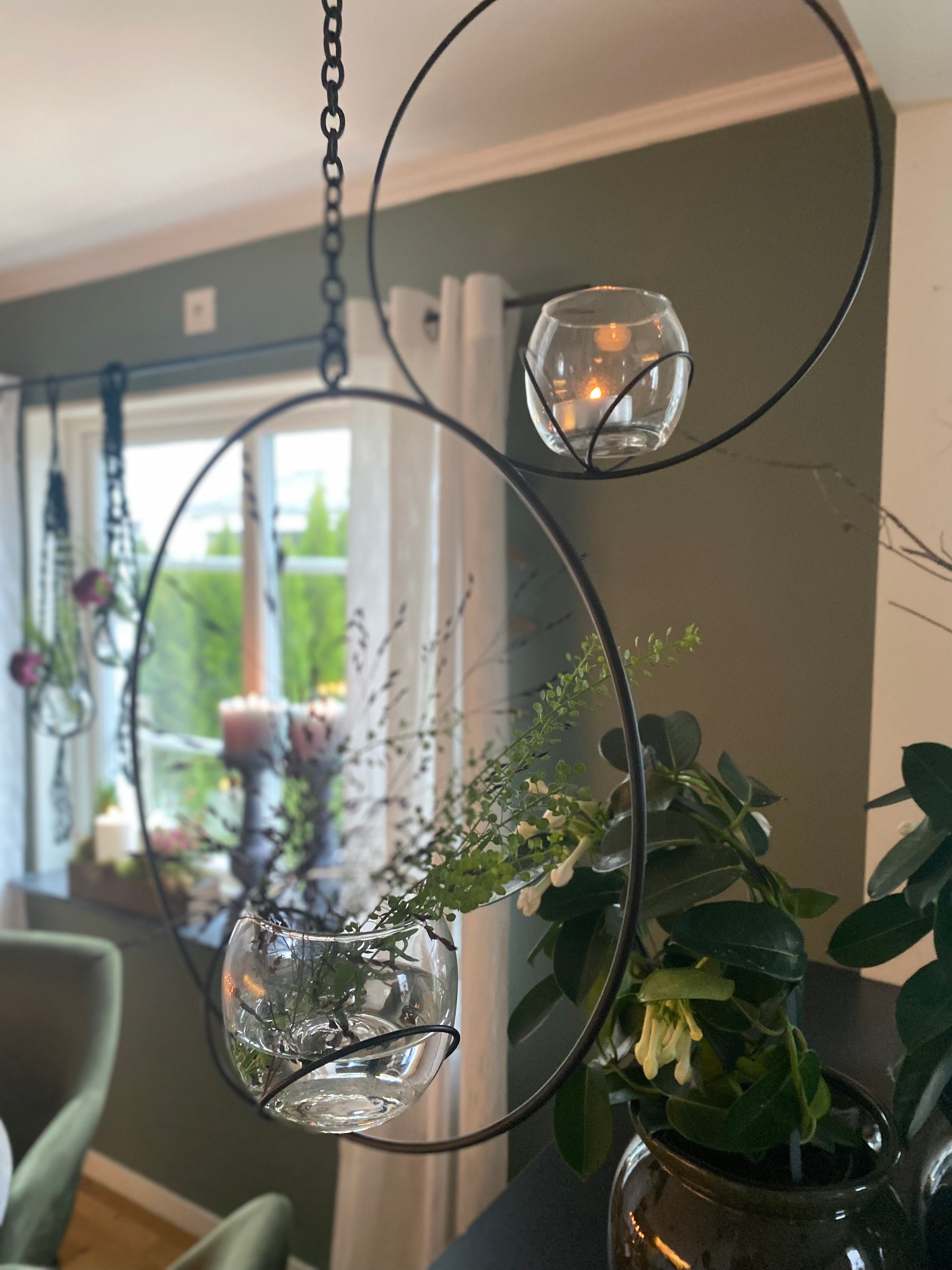Den här hängande metallringen med glaskopp blir superfin att hänga i fönstret med ett värmeljus eller några kvistar.