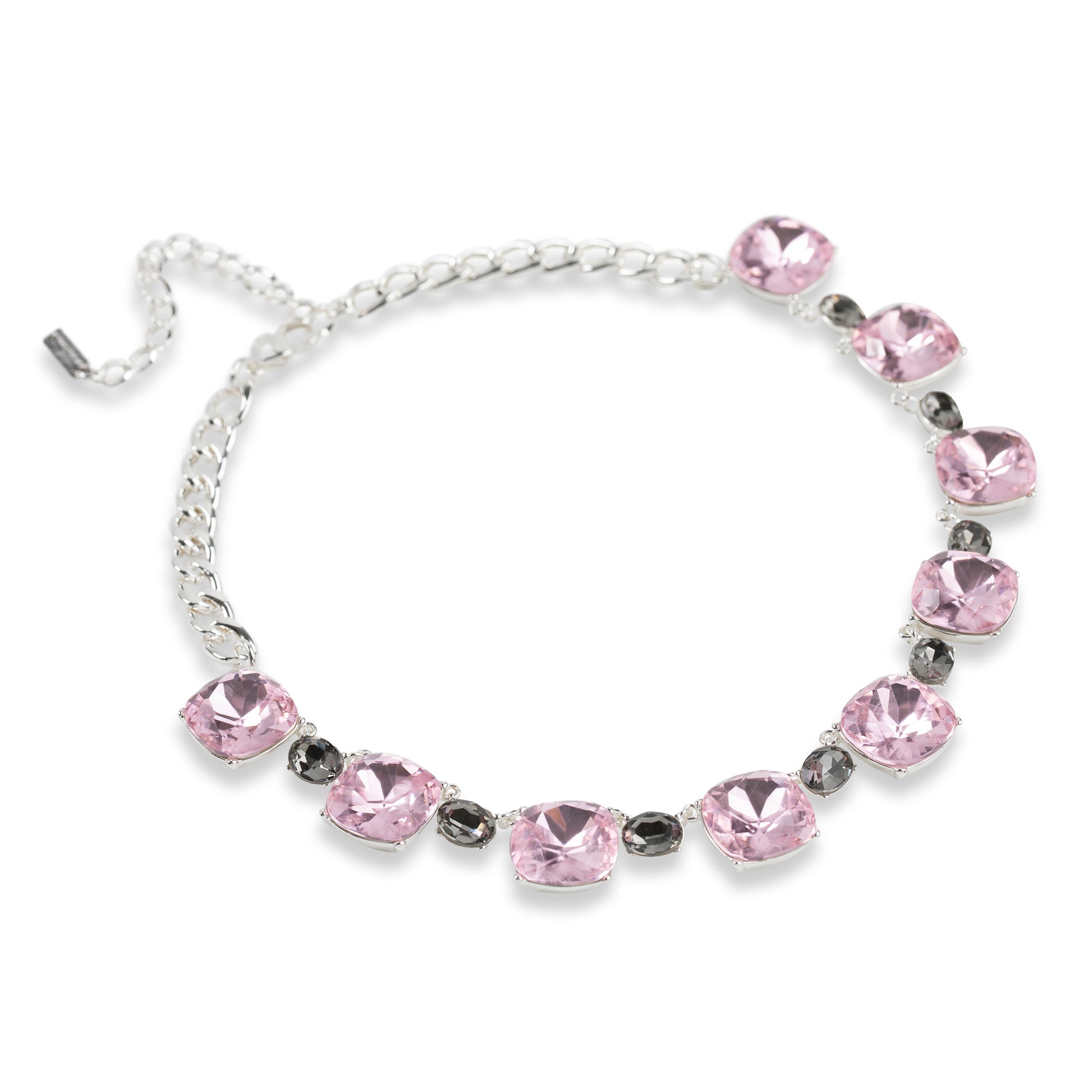 Ett fantastiskt 925 silverpläterat statementhalsband (kan bäras som choker) med rosa och gråa gnistrande glaskristaller. De rosa kristallerna är 1,4 cm stora. Halsbandet är 33 cm långt och har en förlängningskedja som är 7 cm lång. Nickelsäkert.