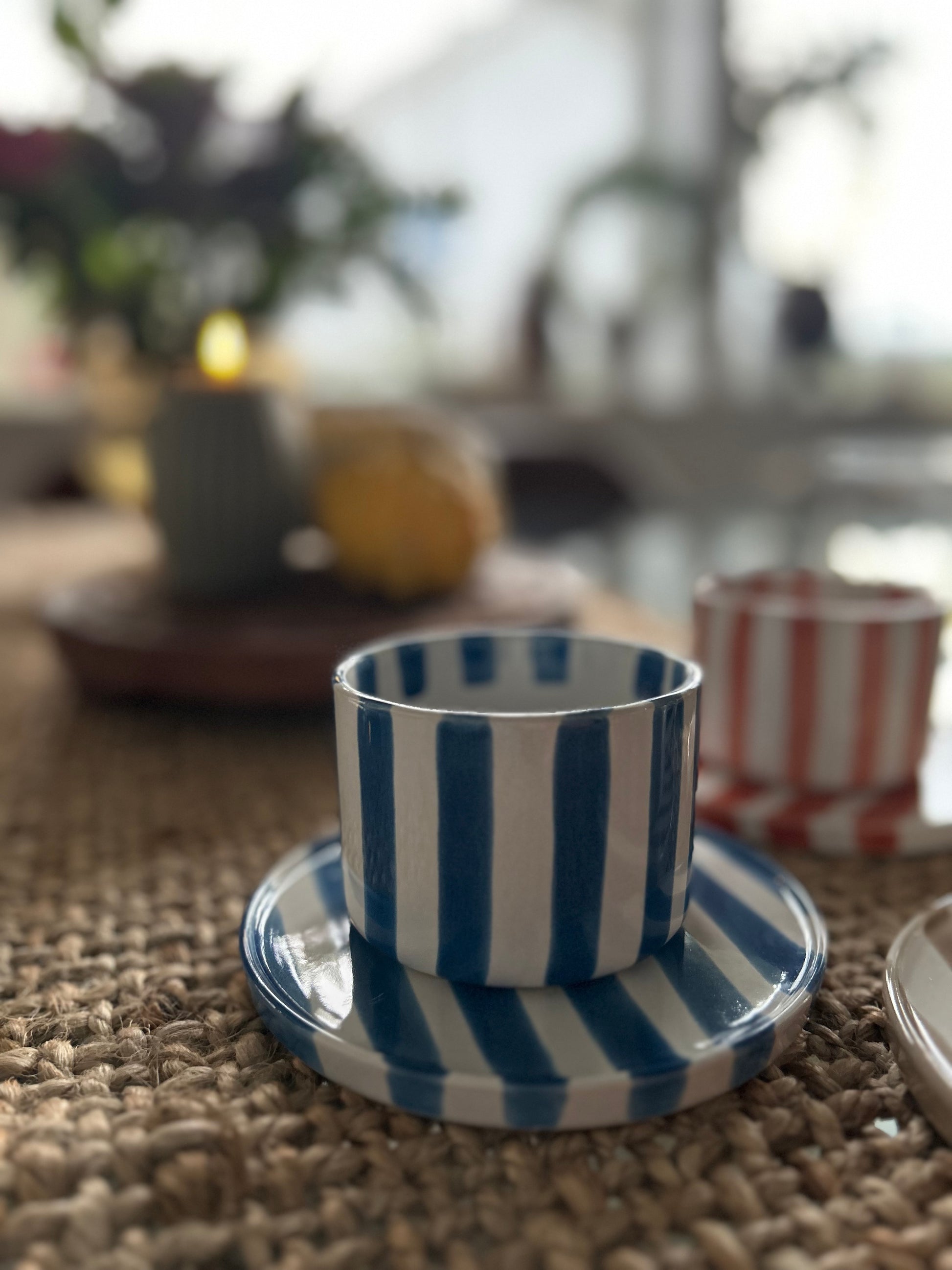 Monica är en trendig, randig och glad kopp med tillhörande fat.