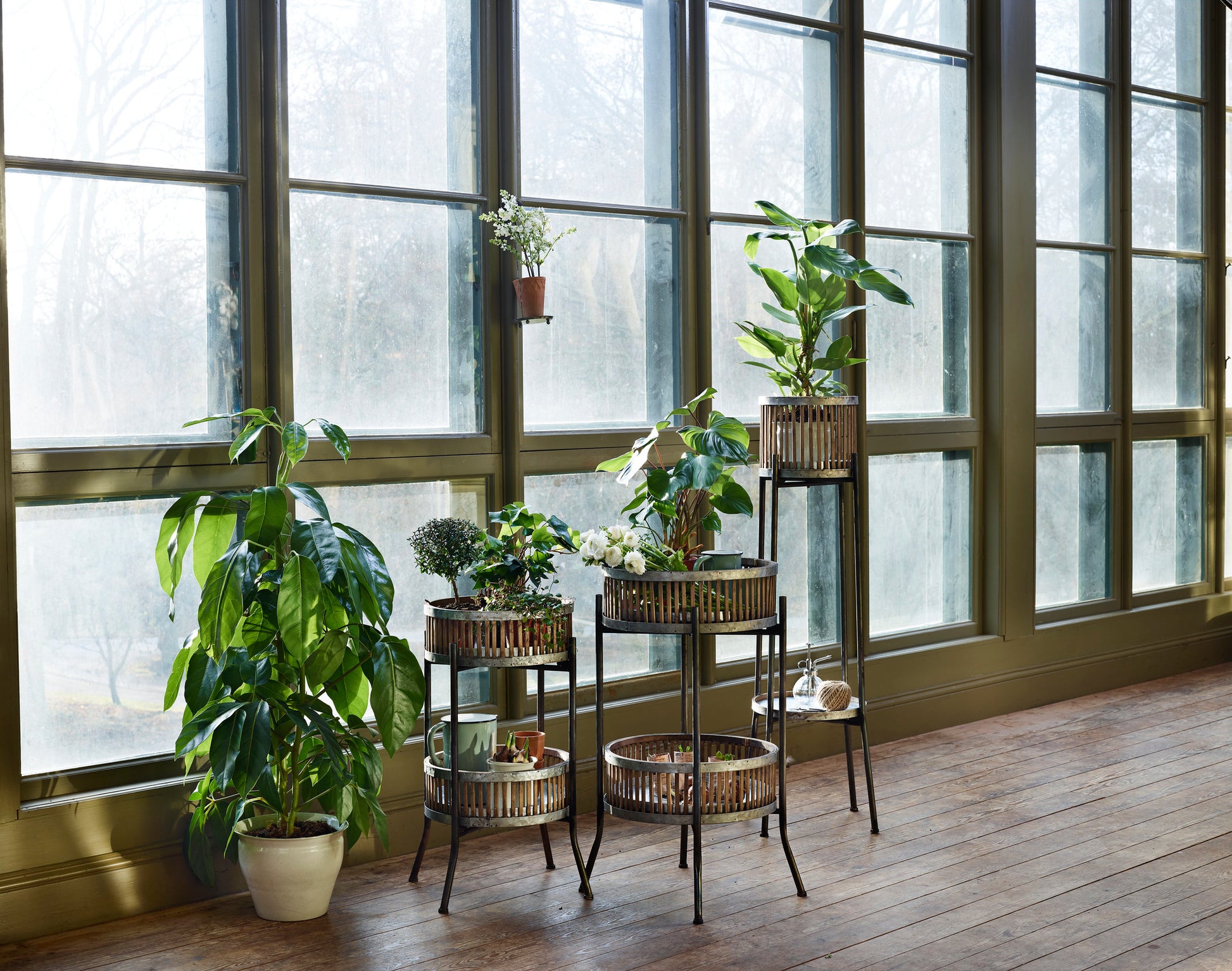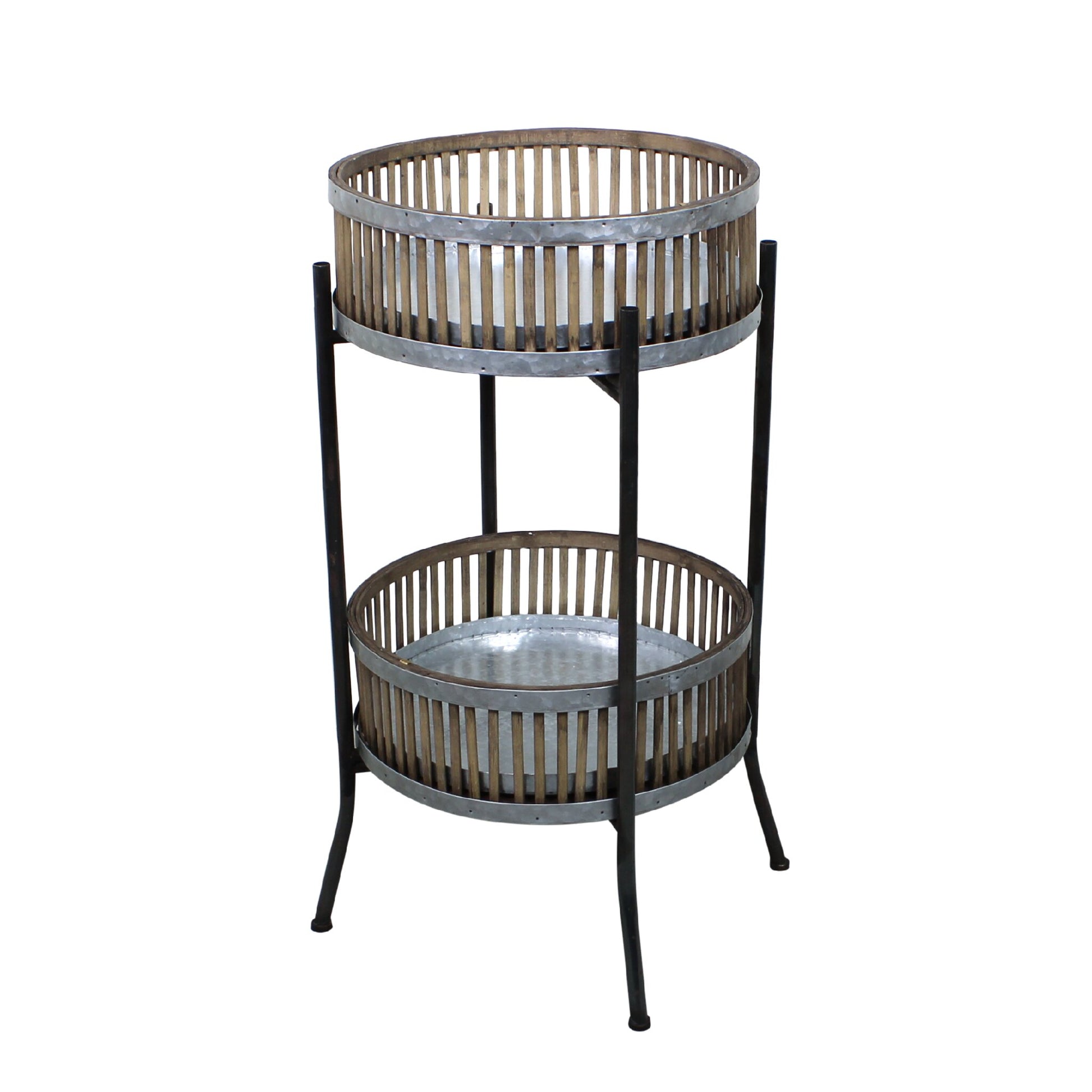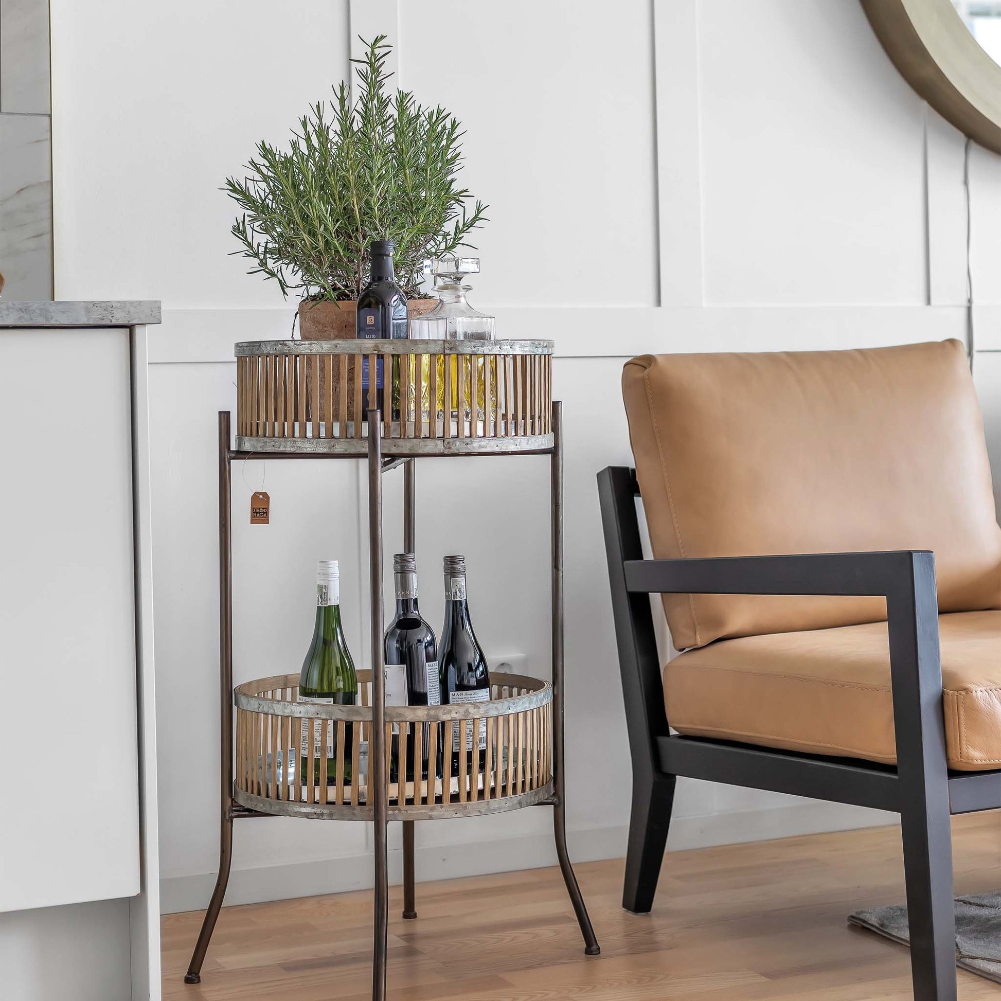 Vacker ställning med två korgar, perfekt för växter och dekorationer eller som avlastningsbord från svenska företaget Strömshaga. Fin i uterum, på balkong eller uteplats. Kan användas som vinställ också. Tänk på att ta in borde då materialet inte tål regn eller fukt. Ställning i svart metall, hyllplan och korg i bambu och förzinkad metall med en botten bestående av en stabil träskiva i plywood.