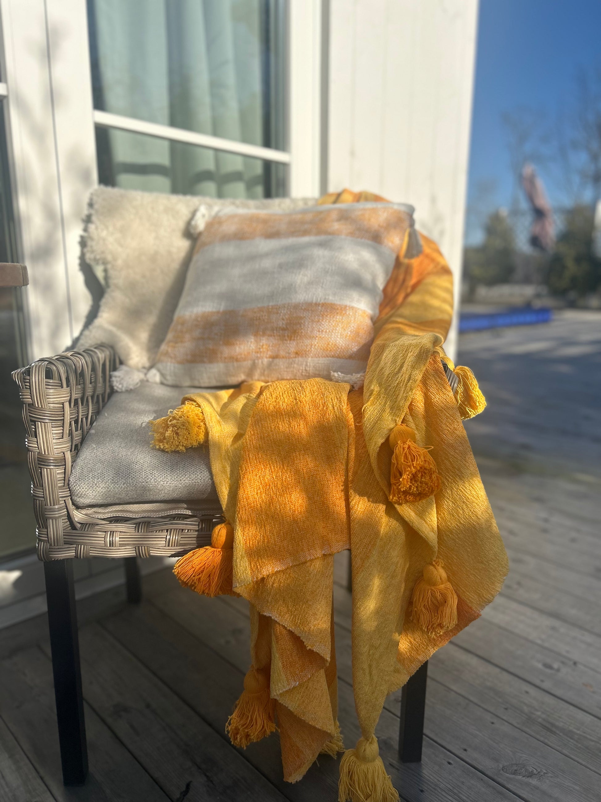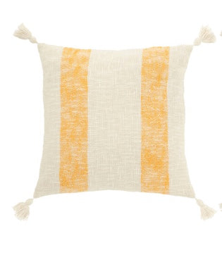 Vilken härlig bredrandig kudde i orange och vitt med tofsar. Innerkudde ingår. Finns att matcha med filt och andra kuddar.
