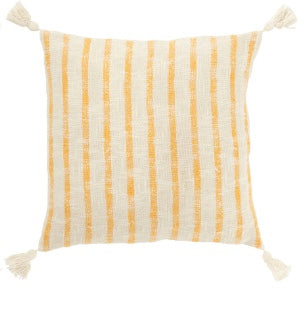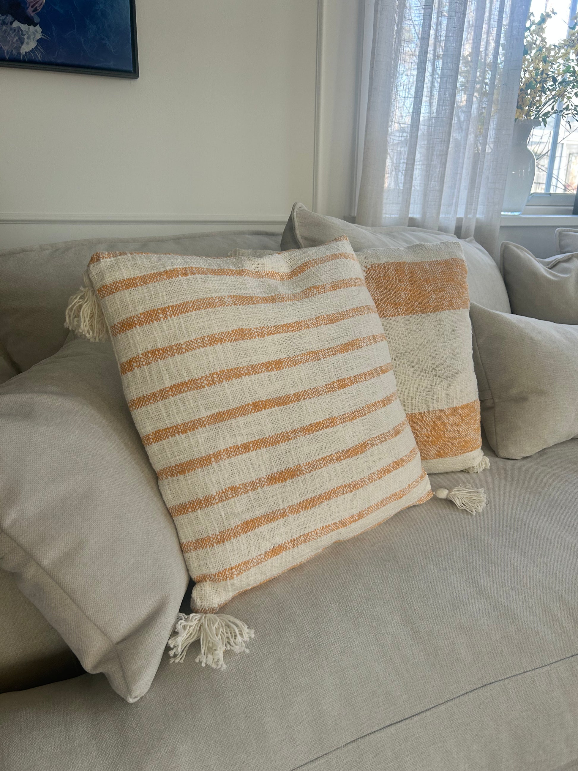 Vilken härlig smalrandig kudde i orange och vitt. Innerkudde ingår. Finns att matcha med filt och andra kuddar.