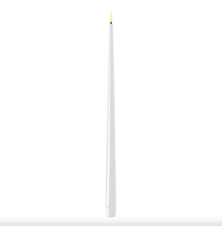 Dekorativa middagsljus LED 2-pack, vita. LED-ljusen har en patenterad 3D Real Flame låga som ger ett verklighetstroget utseende, tillverkade av stearin med innerhölje i plast.