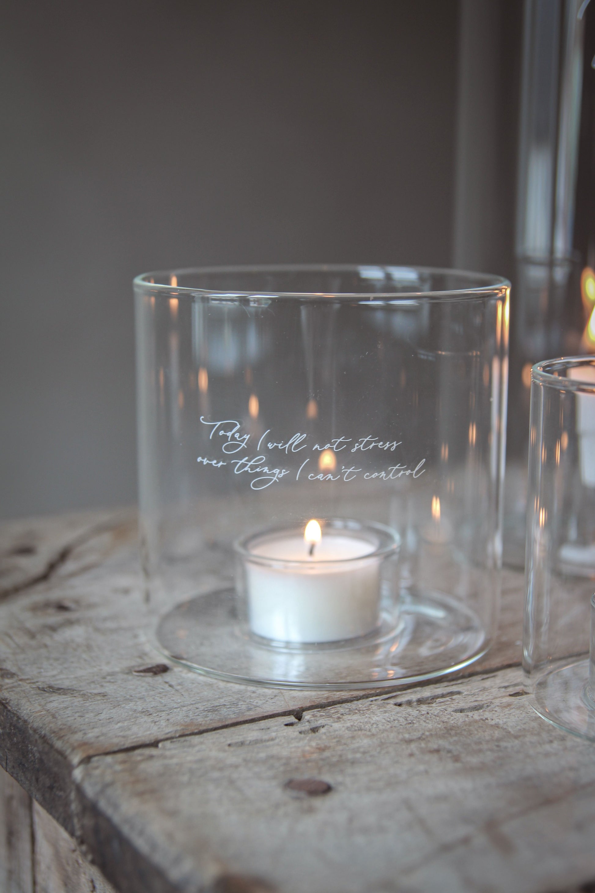 Fin ljuslykta med den vackra texten: TODAY I WILL NOT STRESS OVER THINGS I CAN'T CONTROL