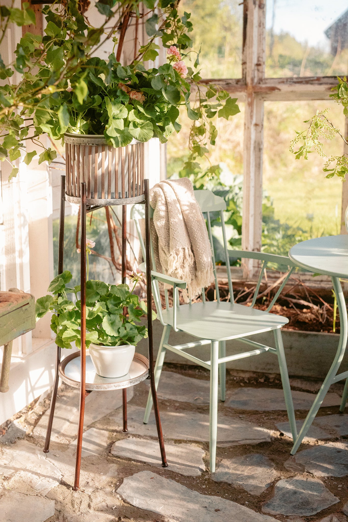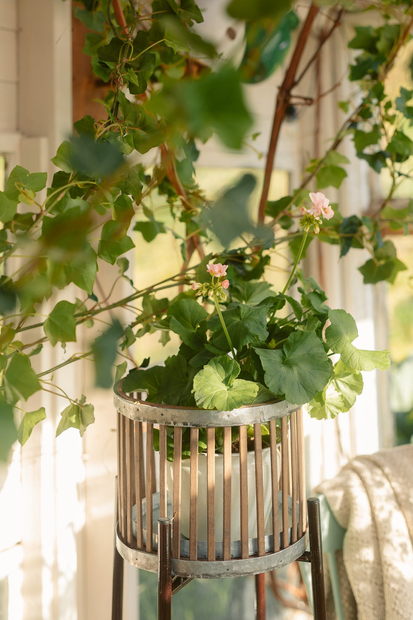 Vacker piedestal med en korg och ett hyllplan för växter och dekorationer från det svenska företaget Strömshaga. Ställning i svart metall, hyllplan och korg i bambu med en platta av förzinkad metall på en botten bestående av en stabil träskiva i plywood.