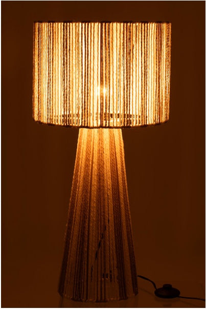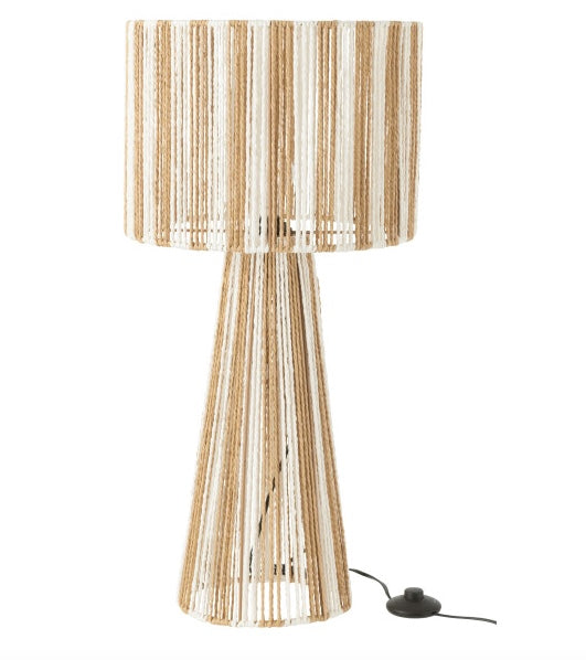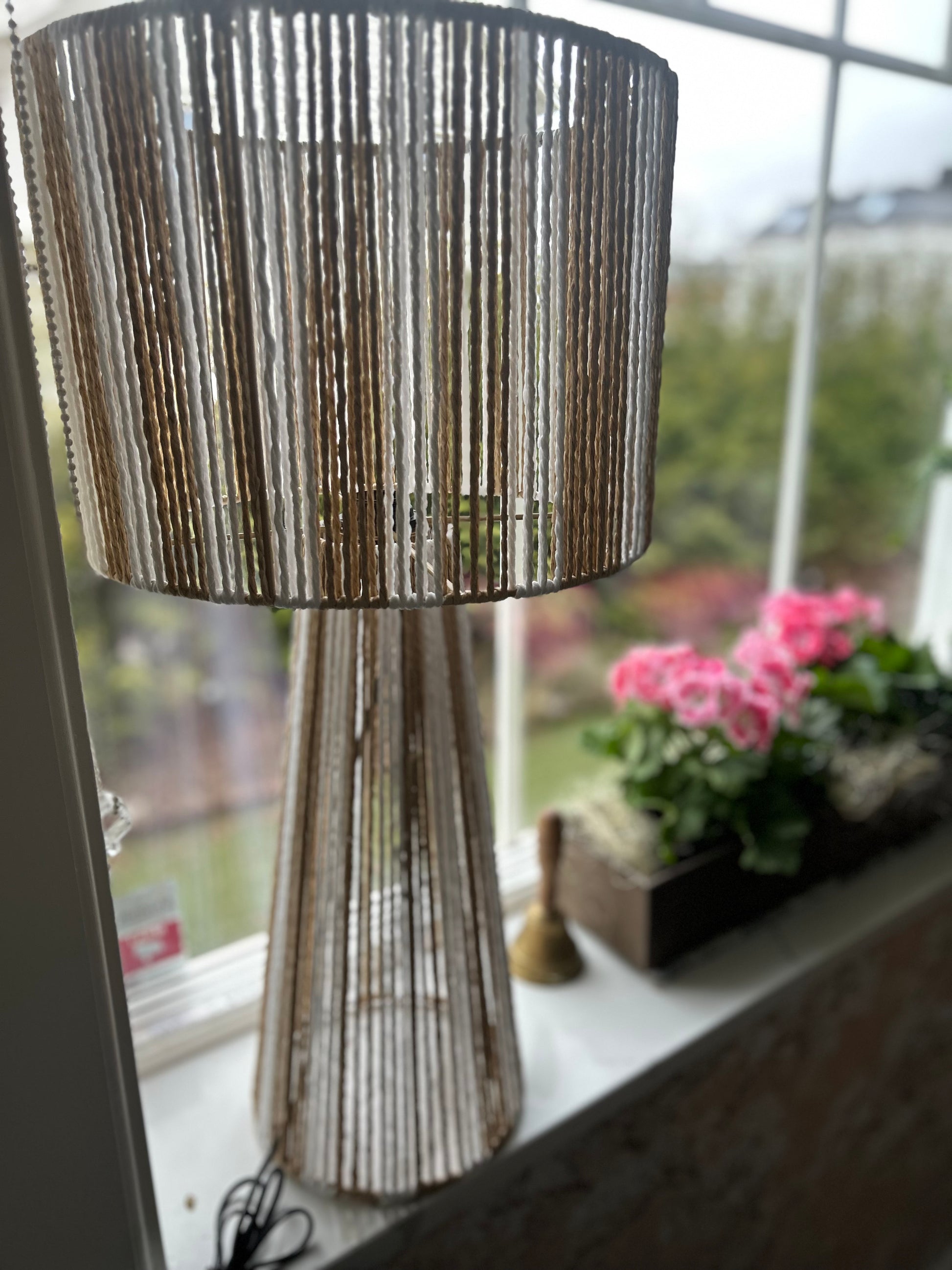 Vilken härlig bordslampa, gjord som en string lampa av papper och metall. Randig i vitt och ljust beige.