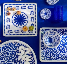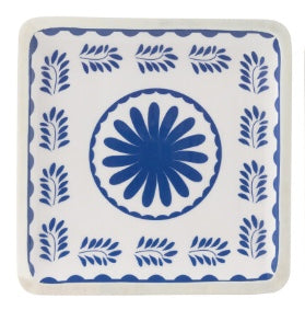 Ett sådant vackert fyrkantigt blå-mönstrat serveringsfat i trä med en högblank plastyta. vackert att lägga upp mat eller använda som dekoration.