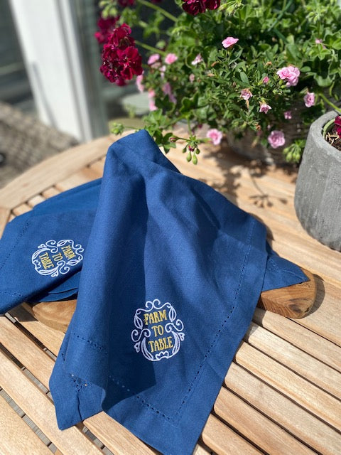 Vackra blå tygservetter i hög kvalitet, broderade med den passande texten Farm to table i vitt och guld. Servetten har en elegant hålsömn.