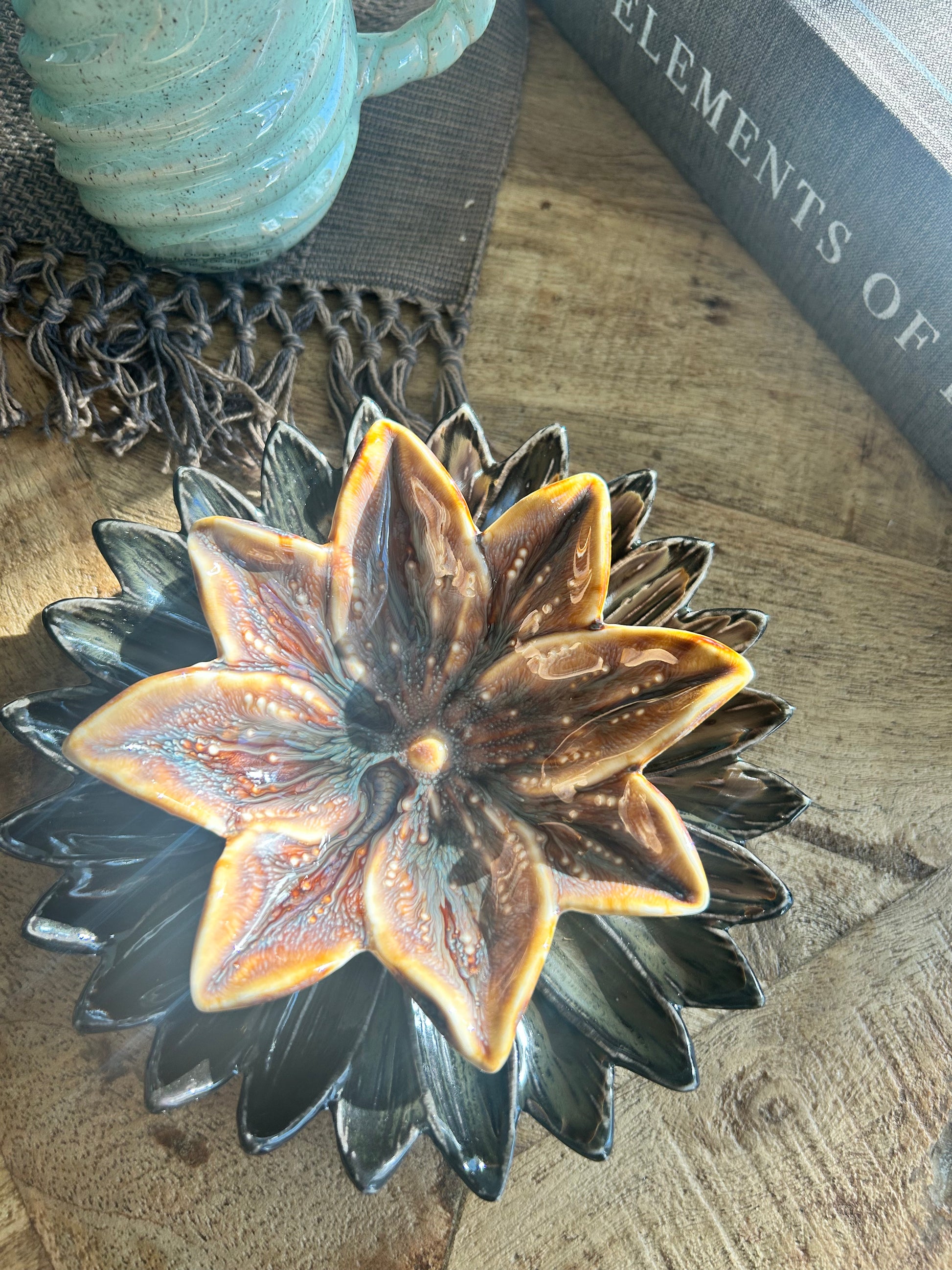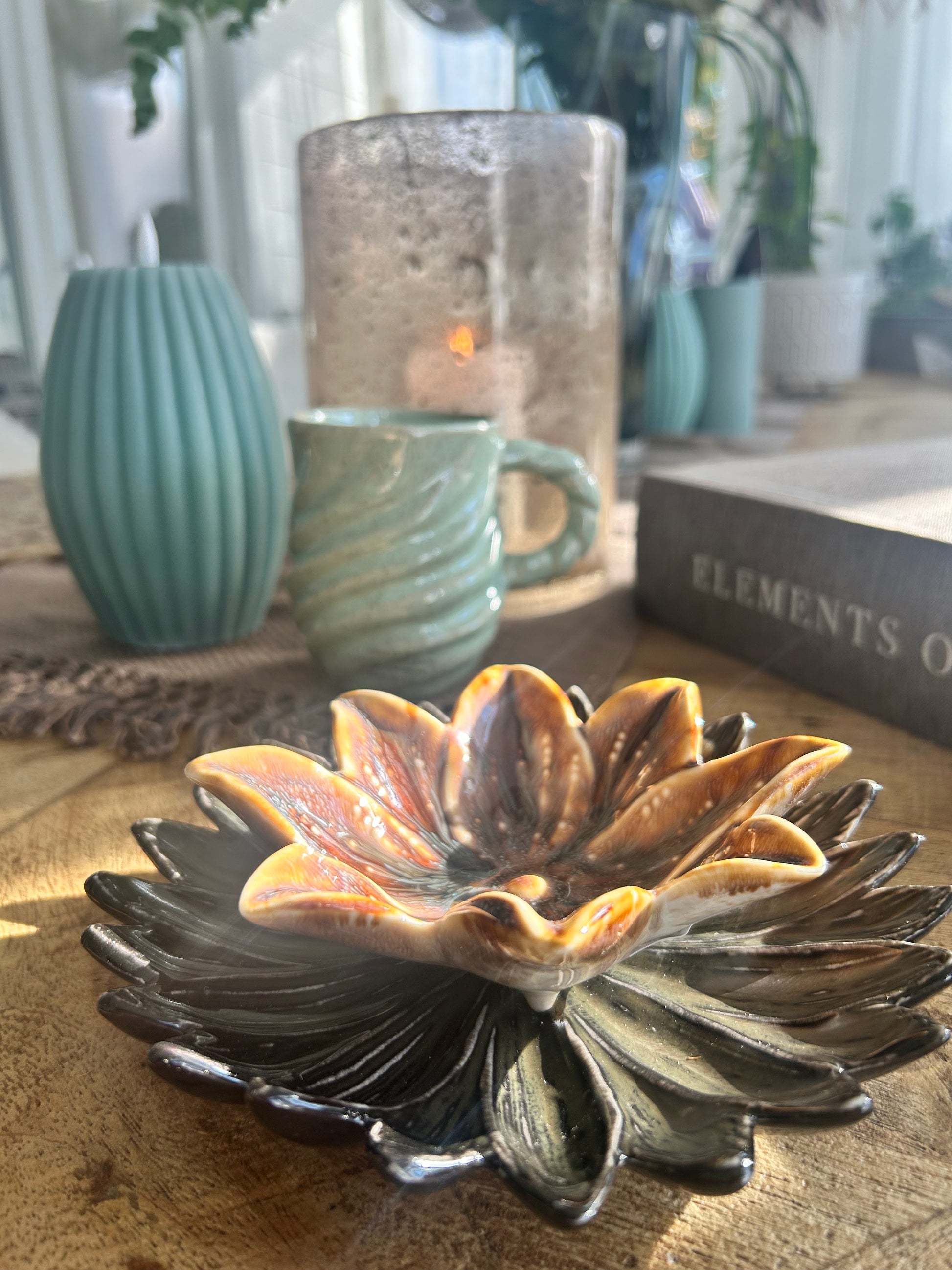 Sådan vacker liten skål utformad som en blomma. Perfekt att lägga smycken i eller andra småsaker. Eller varför inte använda till bordsdukningen. Eftersom den är glaserad så kan färgen variera vilket gör varje skål unik. Tål maskindisk och är mikrovågsugn. Kan användas för mat samt tål även ugn.