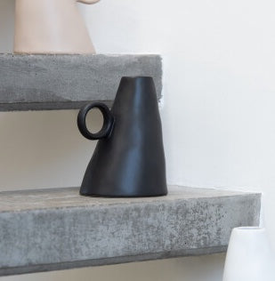 En unik utforming har denna vas med en lutande design och ett runt handtag.