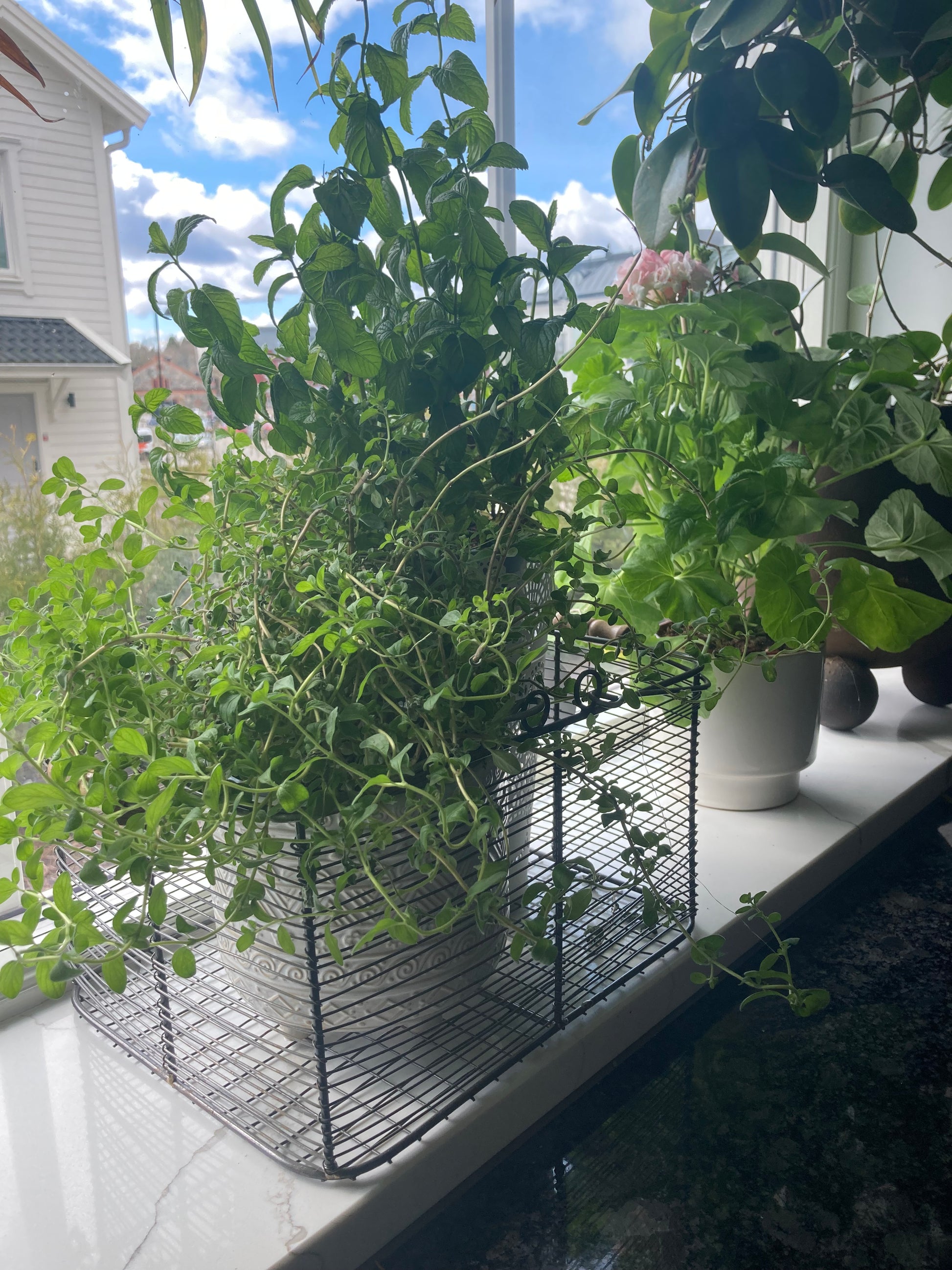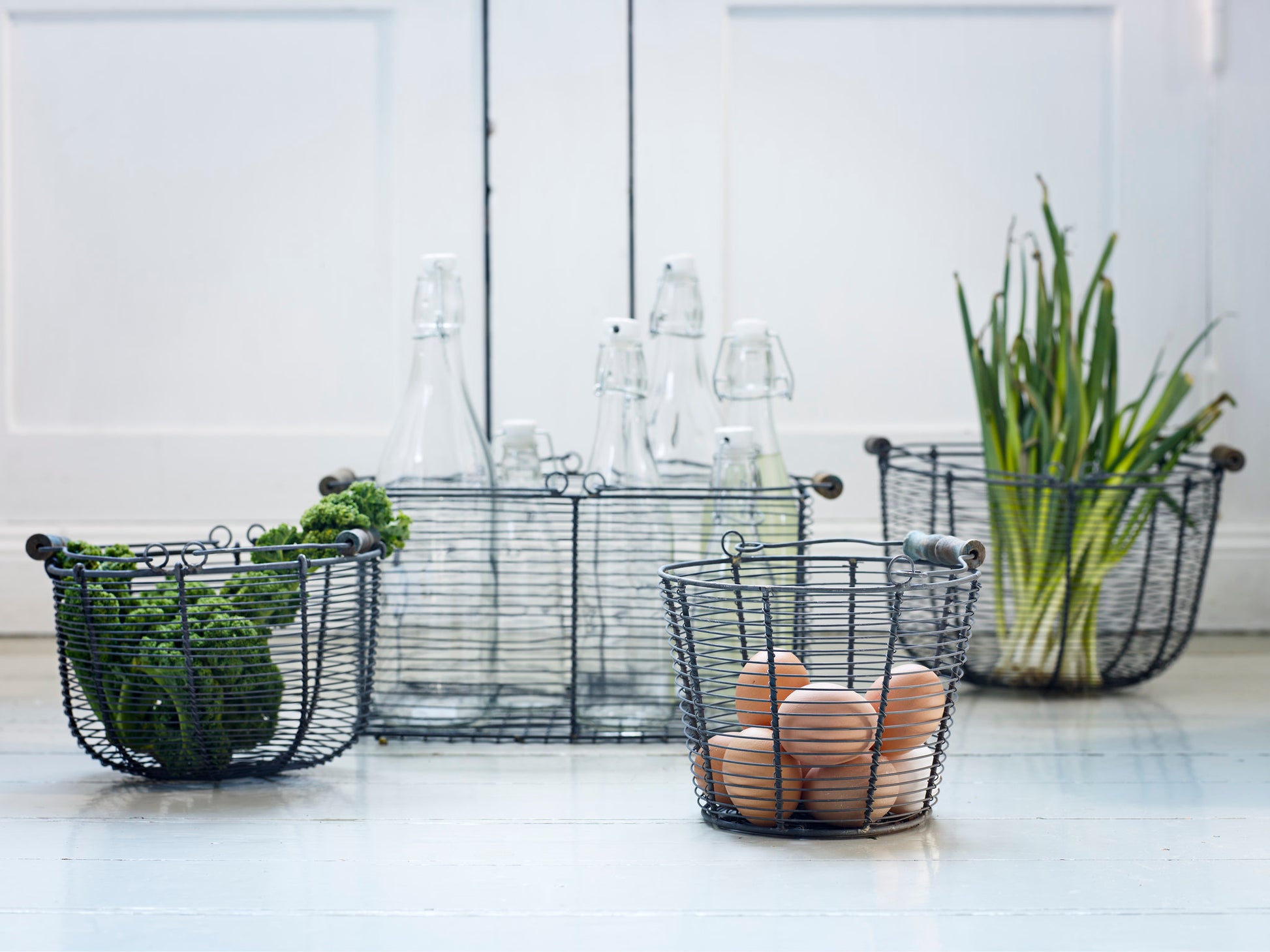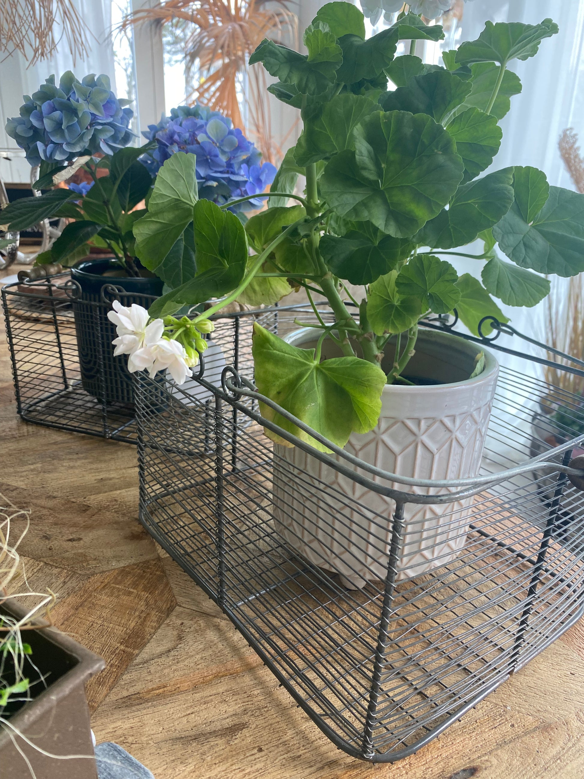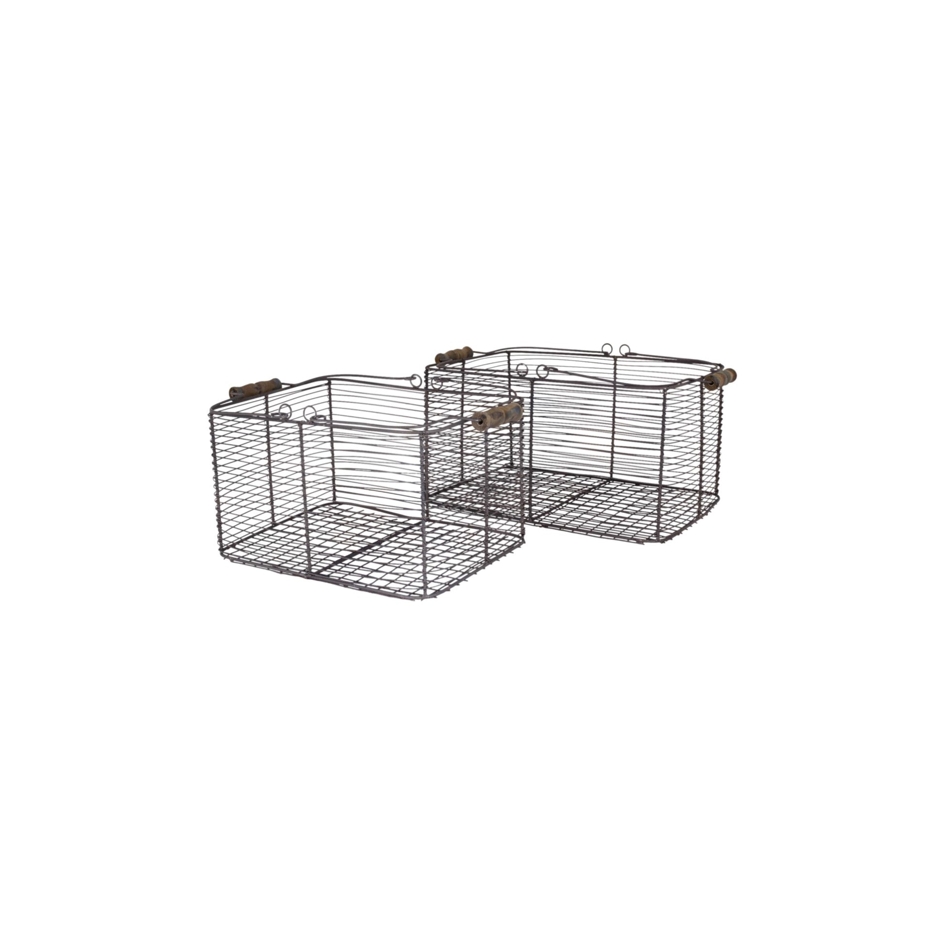 Rektangulär trådkorg i zink med trähandtag. Perfekt för all typ av förvaring. Fin i köket med grönsaker eller frukt eller ute i trädgården med blommor. Korgen säljs i set om två.