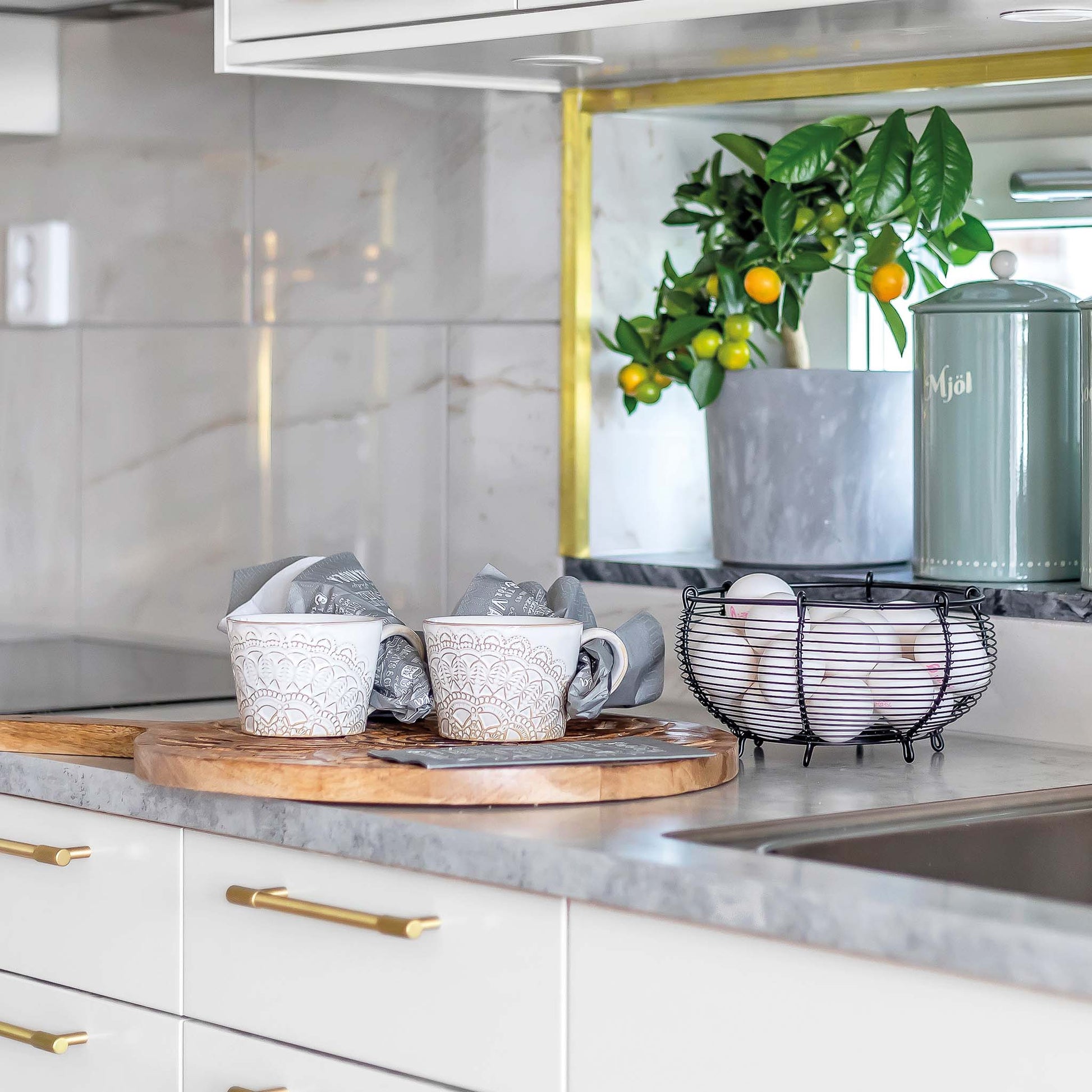 Liten rund svart trådkorg till servering av bl.a. frukt, ägg och småkakor eller som brödkorg.