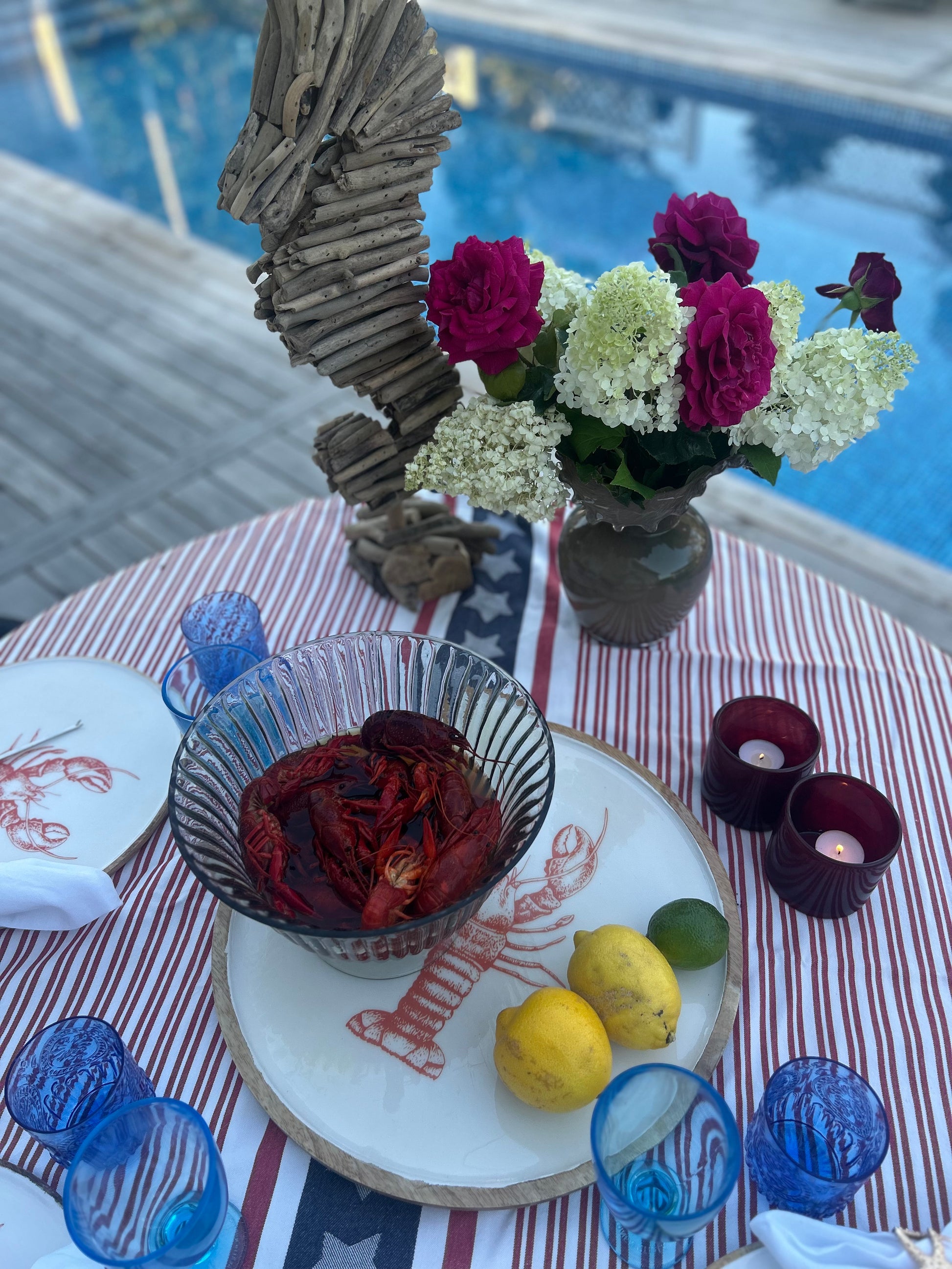 Fatet har ett mönster med ett hummermotiv. Lika fin som serveringsfat som dekoration. Eftersom de är handgjorda är varje fat unikt.