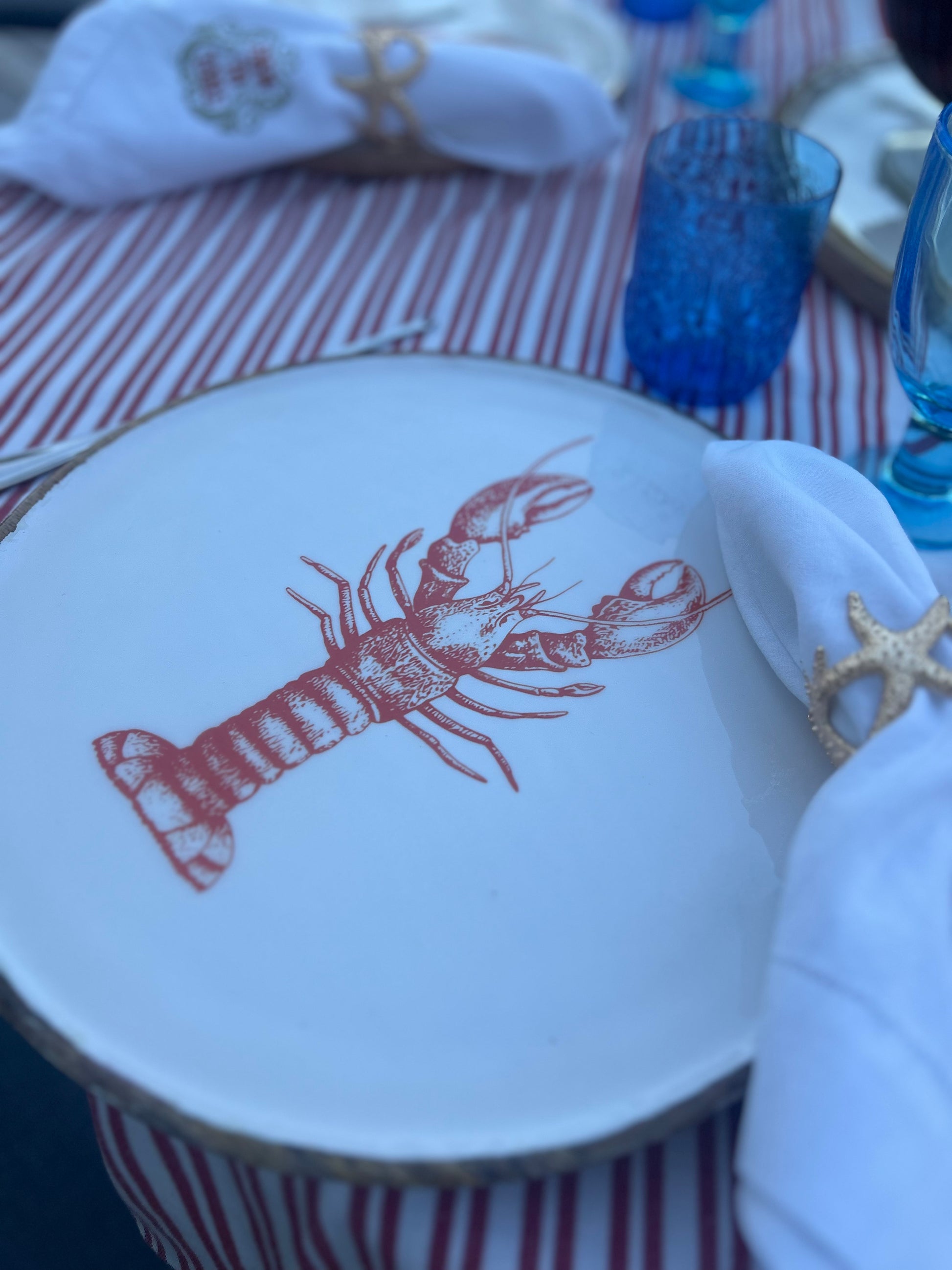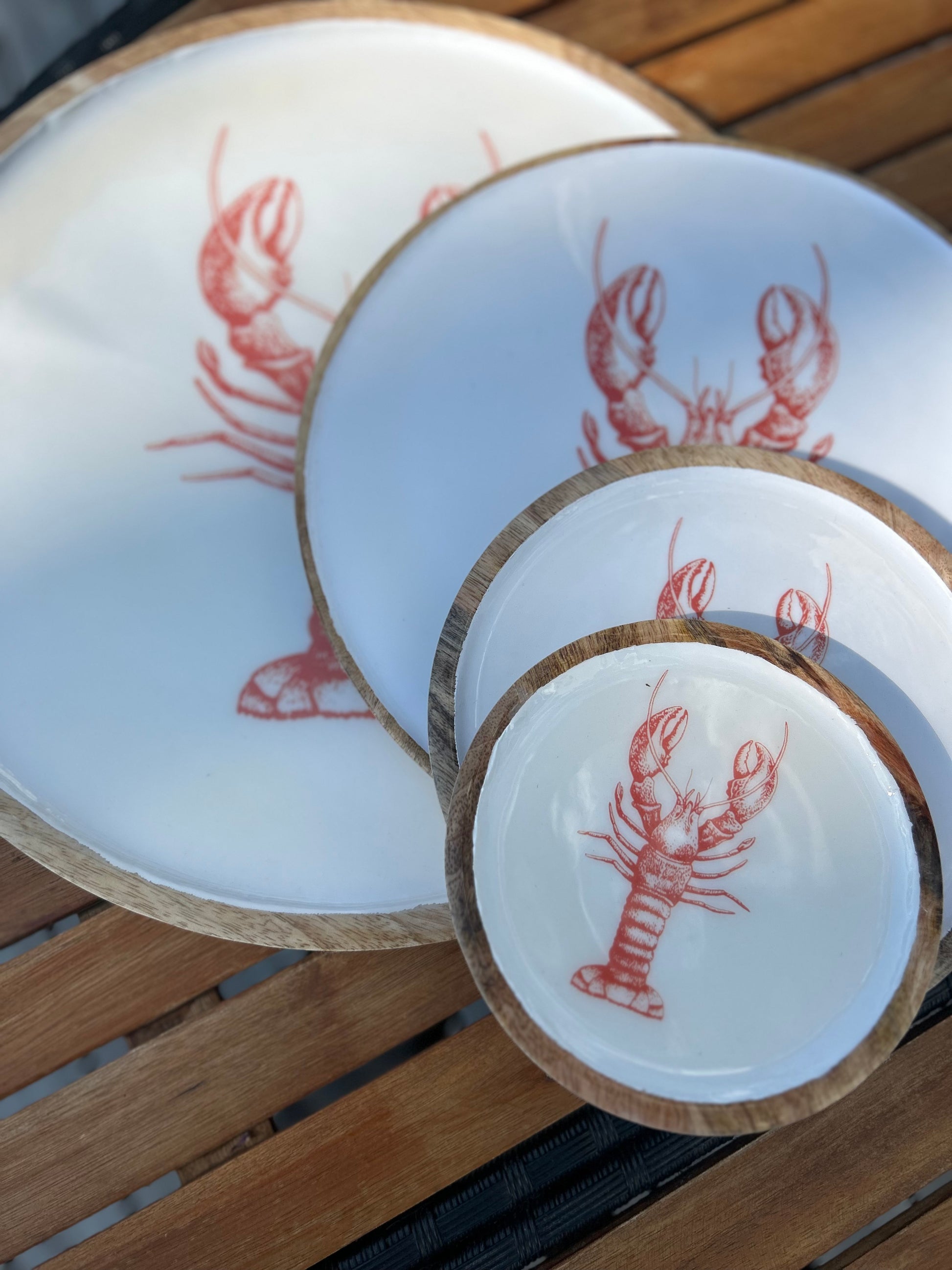 Fatet har ett mönster av ett hummermotiv. Lika fin som tallrik, tallriksunderlägg eller som dekoration. Eftersom de är handgjorda är varje fat unikt.