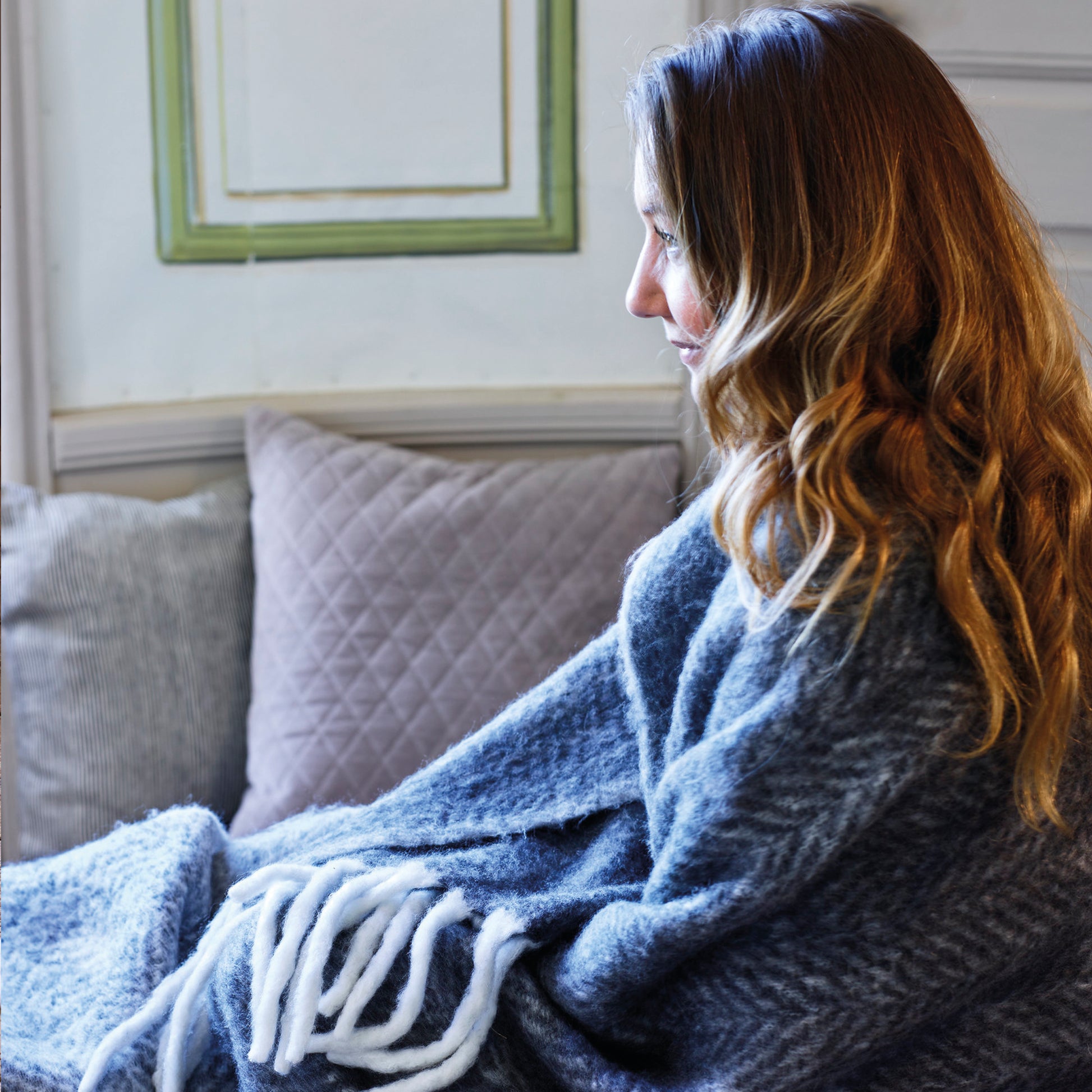 Mjuk och skön pläd i vävt och filtat material, med fransar i vitt från svenska företaget Strömshaga.