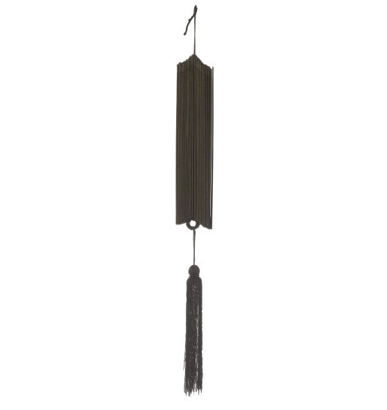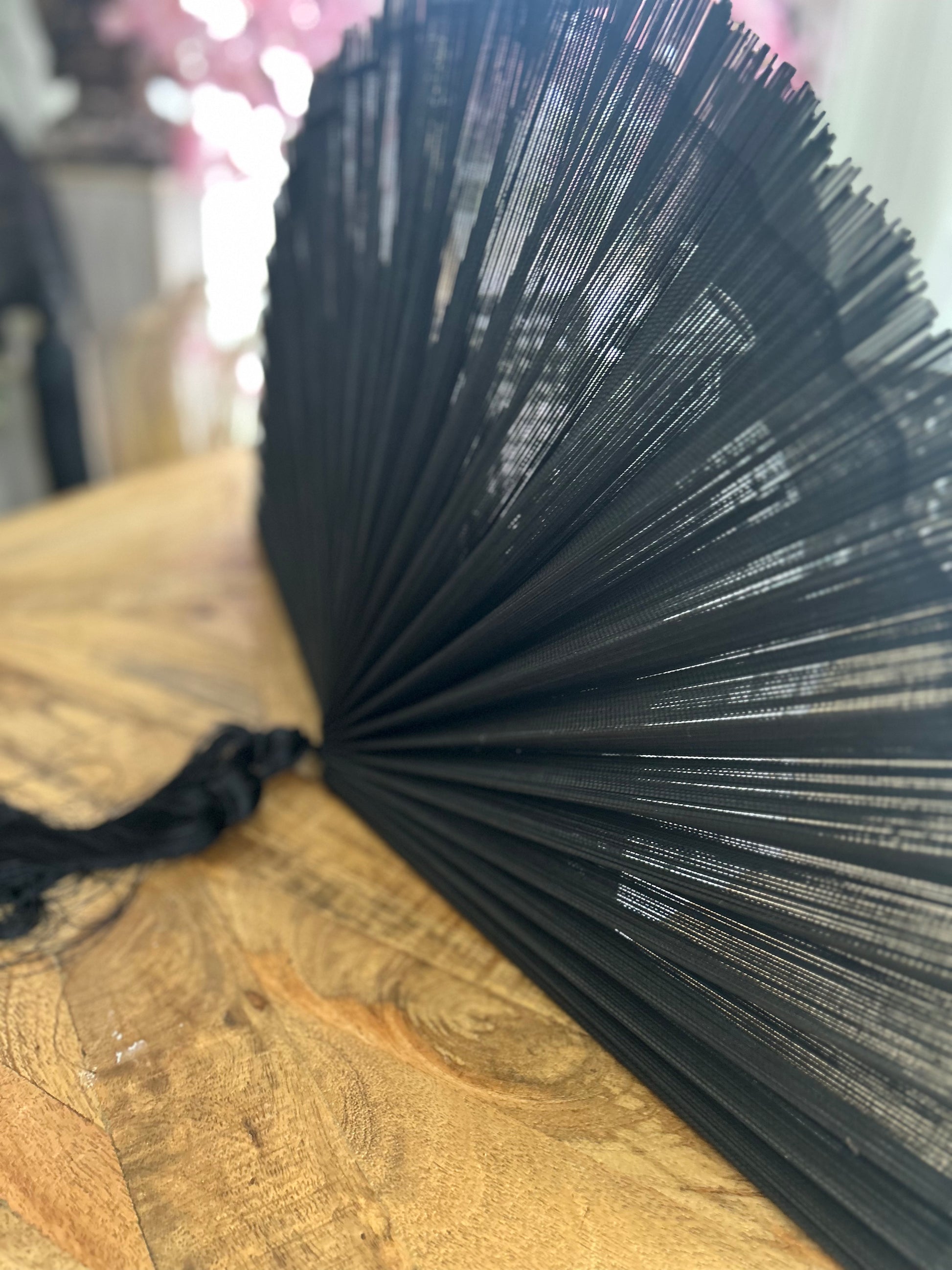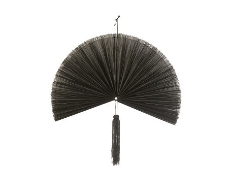 Så häftig och unik vägg dekoration i form av en solfjäder med långa fina tofsar, svart. Fin att ha på väggen i ett sovrum eller i en hall. Upphängningsanordning finns.