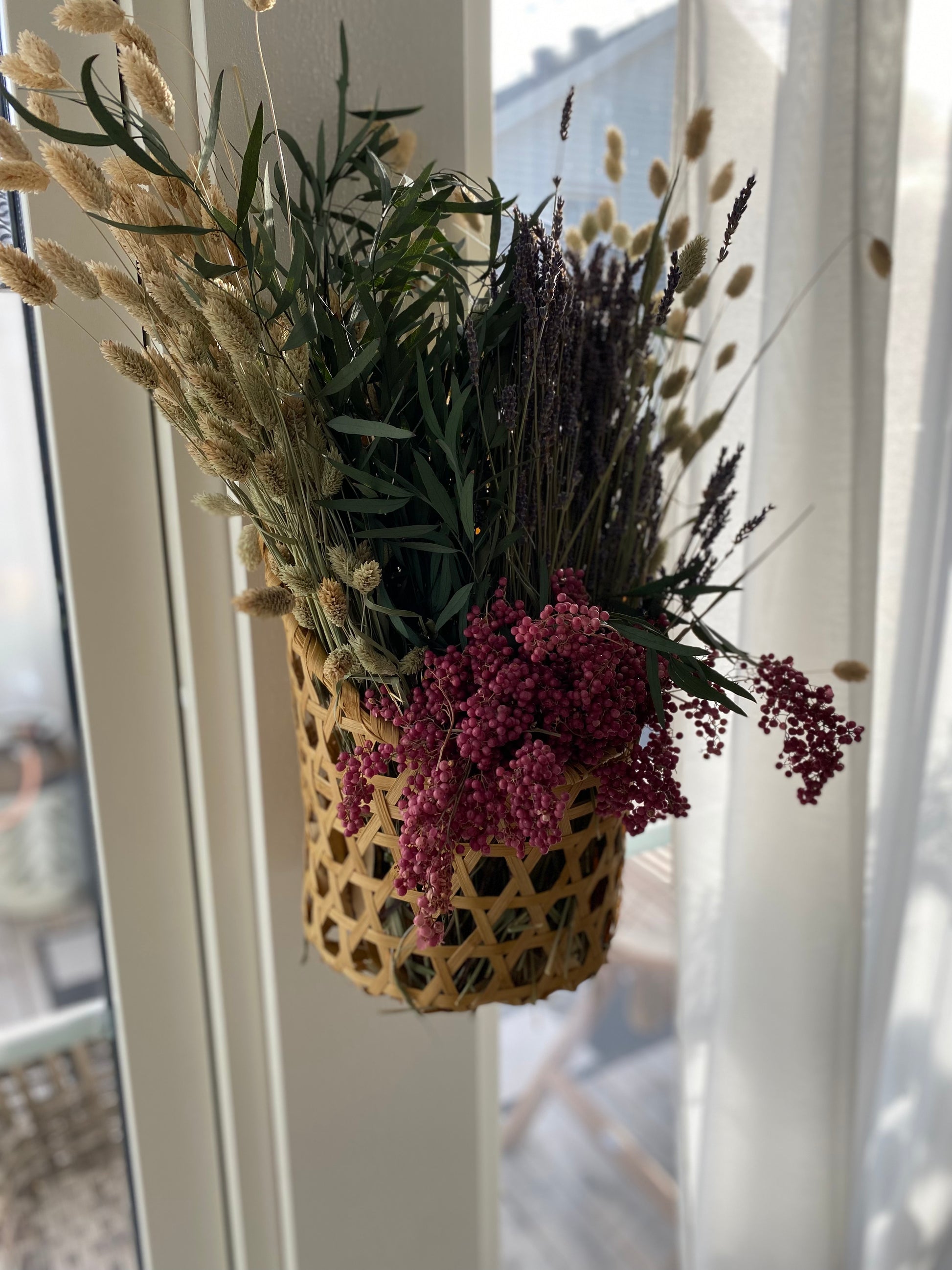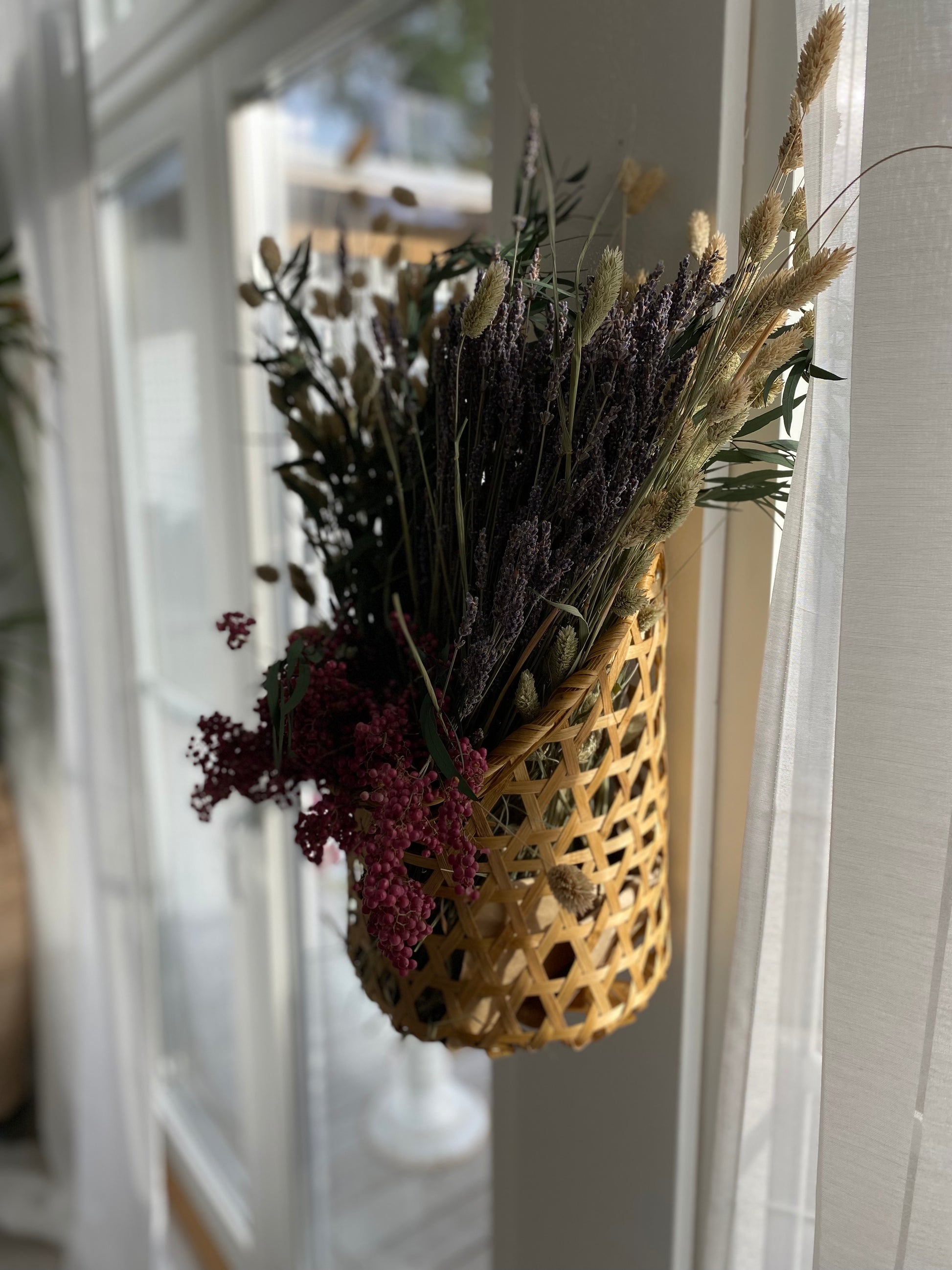 Fin väggkorg av bambu som är vacker att ha konstgjorda blommor i eller använda som förvaring.
