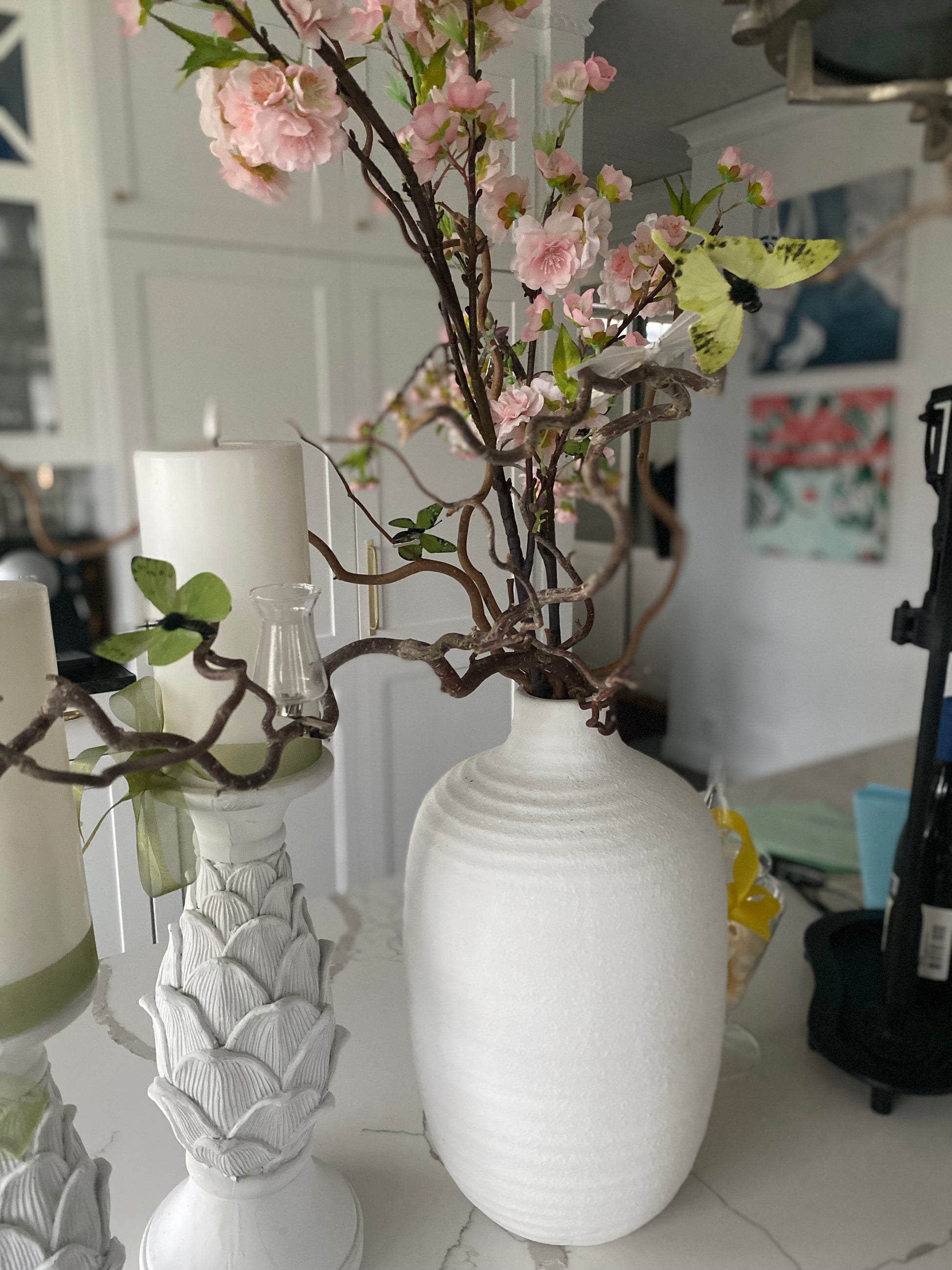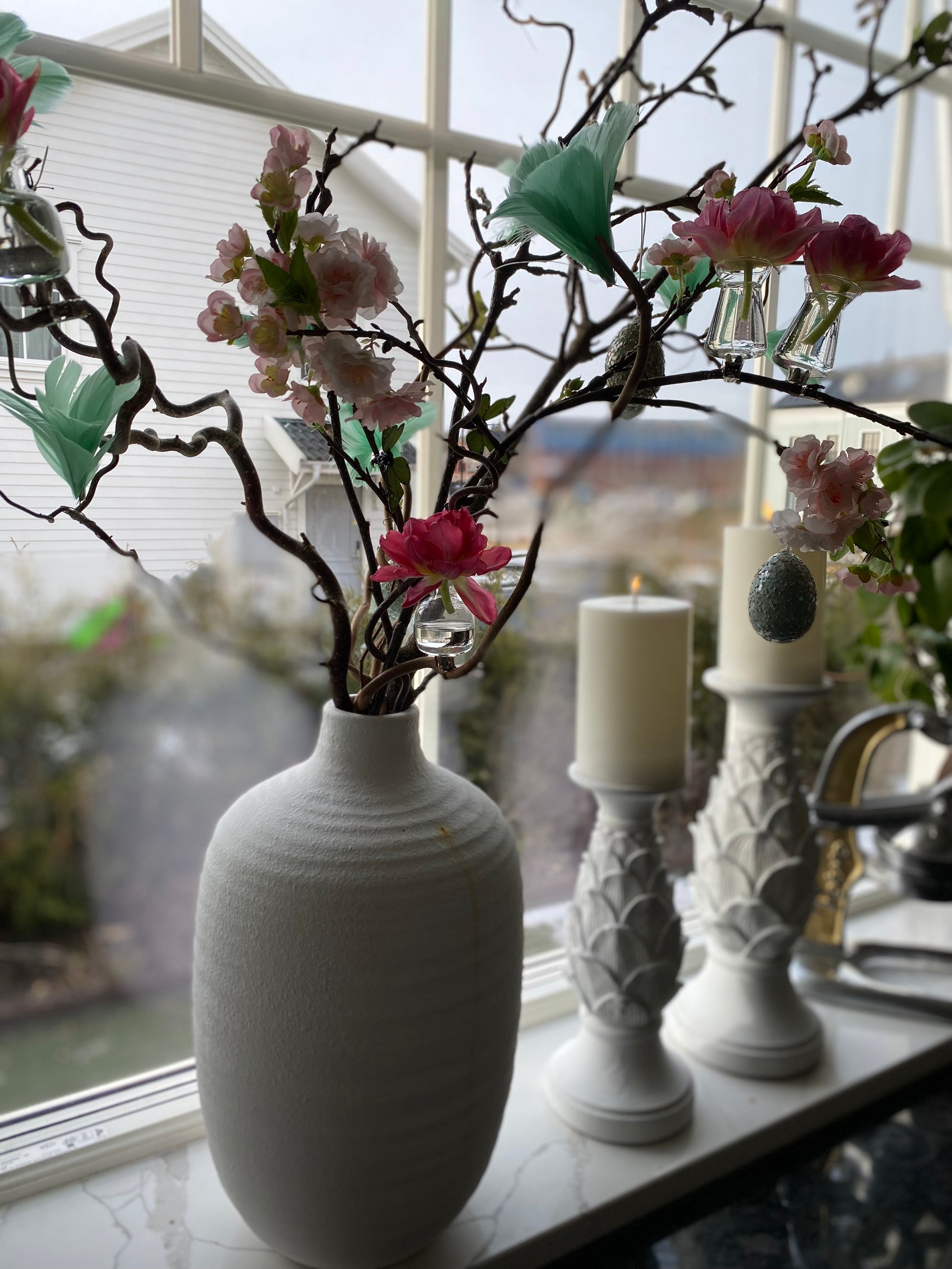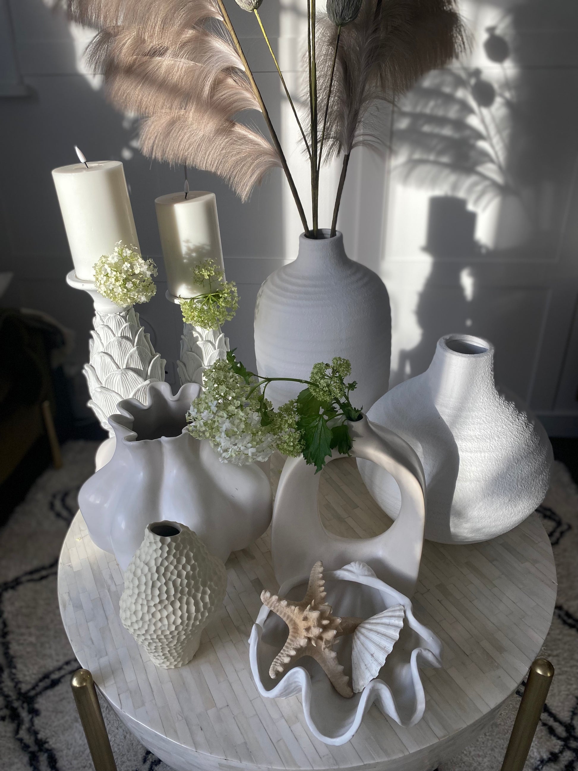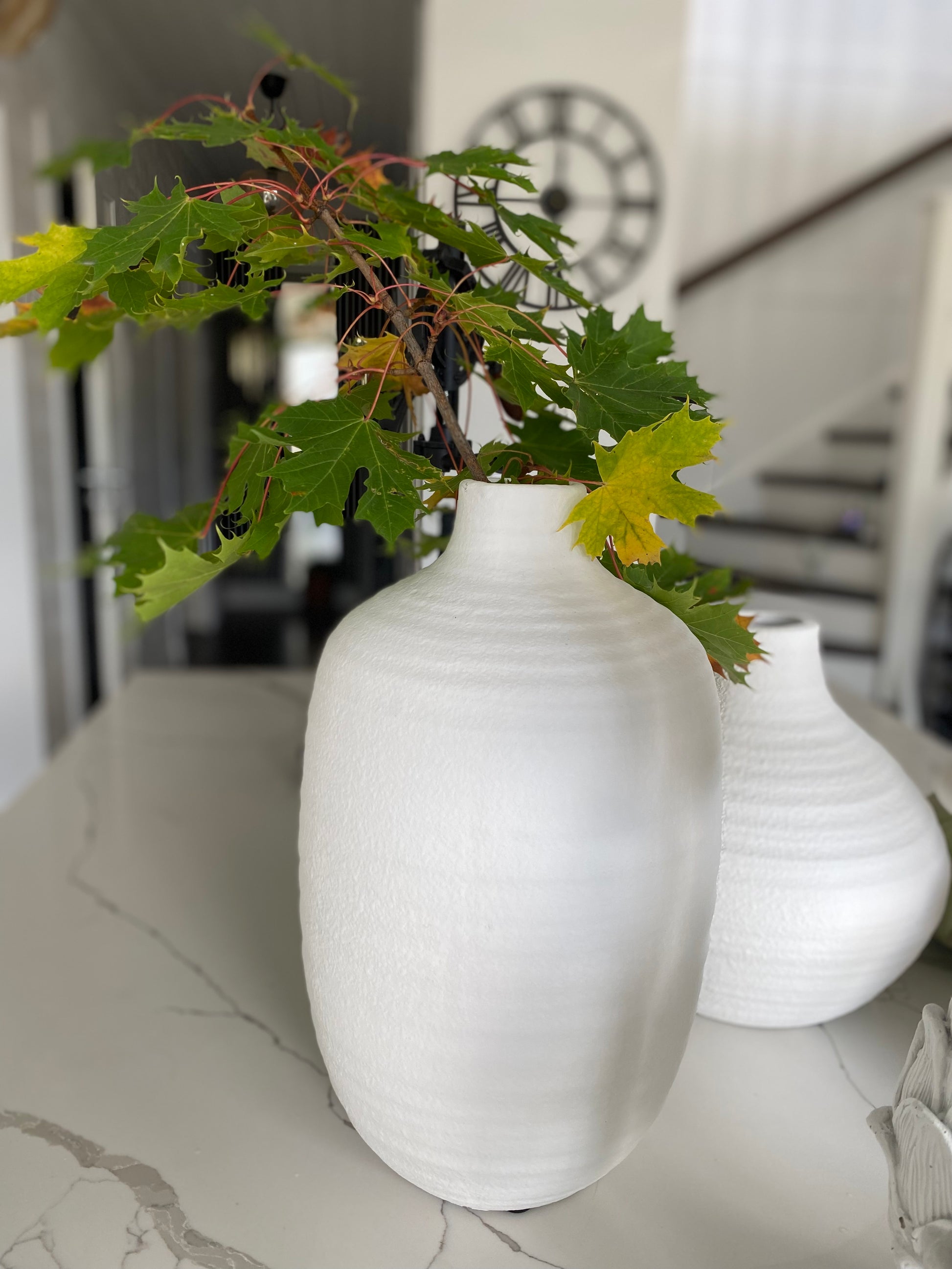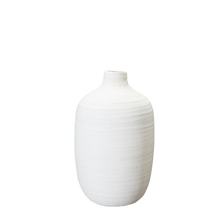Tjusig hög vit vas i stengods som även går utmärkt att ha på golvet. Fin att kombinera men vår andra höga vas i samma serie med artikelns 92163.