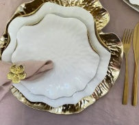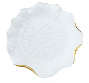 Vitt vackert tallrik med guldkant. Designen påminner om ett snäckskal.